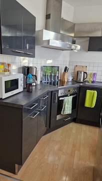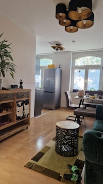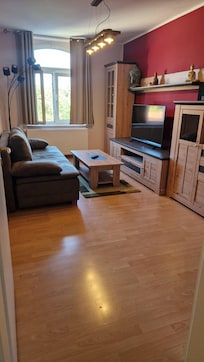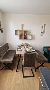 Die Ferienwohnung entspricht der Beschreibung und auch die Foto's sind zutreffend. Meine Kinder(7 und 10Jahre) und ich selbst haben uns sofort wohl gefühlt.Die Einrichtung und Dekoration ist außergewöhnlich gegenüber anderen Ferienobjekten. Nicht so steril und unpersönlich, sondern warm und gemütlich.Es gibt in allen Zimmern ausreichend Stauraum. Die Küche ist ebenfalls sehr gut ausgestattet ( zum ersten Mal hatten wir scharfe Küchenmesser). Es gibt viele moderne Küchengeräte, sowie eine neue Kühl/Gefrier- Kombi. Der zweite Fernseher ist an verregneten Tagen auch praktisch. Die Lage am Stadtrand ist angenehm. In der Nähe befinden sich verschiedene Supermärkte, Lokale und eine Tankstelle.Wir waren innerhalb weniger Minuten am Markleeberger See. Dieser hat klares, sauberes Wasser. Nur die Steine haben etwas gestört. Es empfehlen sich Badeschuhe. Auch zu anderen Ausflugszielen ist es nicht weit. Egal ob mit dem Fahrrad oder Auto. Dank des Navi's fährt man auch gut Richtung Innenstadt oder Tierpark. Das parken war auch kein Problem. Wir haben einen großen Kombi und haben immer einen Platz gefunden.Einen Punkt ziehe ich ab für den Staub. Mein Sohn ist Allergiker. Ich muss dadurch zwar immer alles kontrollieren. An einigen Stellen lag aber sehr viel Staub. Ansonsten waren wir mit der Sauberkeit zufrieden.Mein Fazit: sehr empfehlenswert, wir kommen bestimmt wieder.