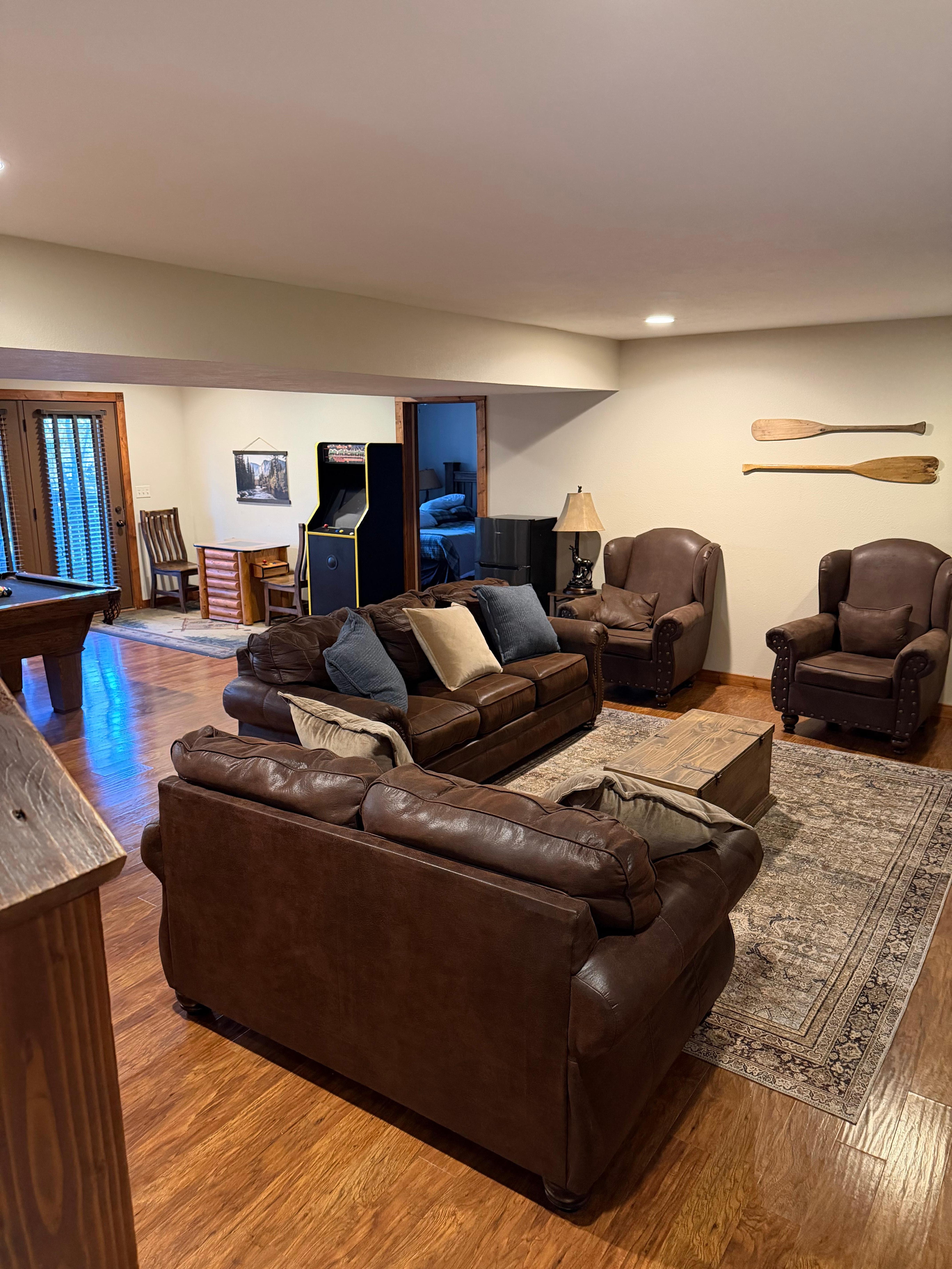 Downstairs we have 2 more bedrooms with 2 queen beds each and another living area allowing your group to spread out! This second living area is prepped to enjoy a nice movie as well as stocked with games for the whole family to enjoy! We have a full-size pool table and two full-size multicades featuring Donkey Kong, PacMan, Joust, Frogger, and more! But leave your coins at home, these games play for free!!