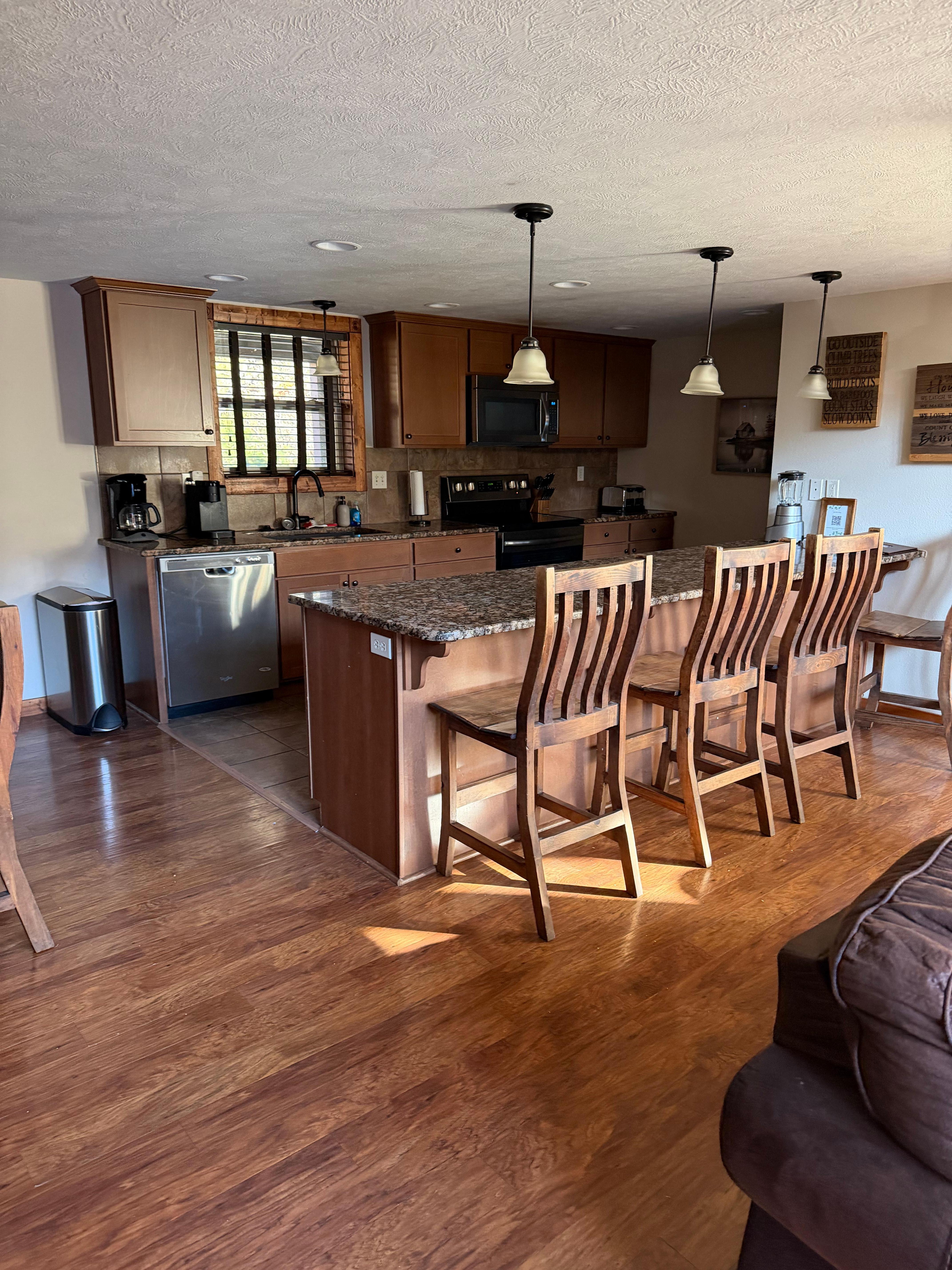 Speaking of dinner, our kitchen comes fully stocked with everything you would need to prepare your favorite dish! We have both a Keurig and a regular coffee pot, a blender, a pancake griddle, pots and pans, a crockpot and so much more! Make yourself at home!