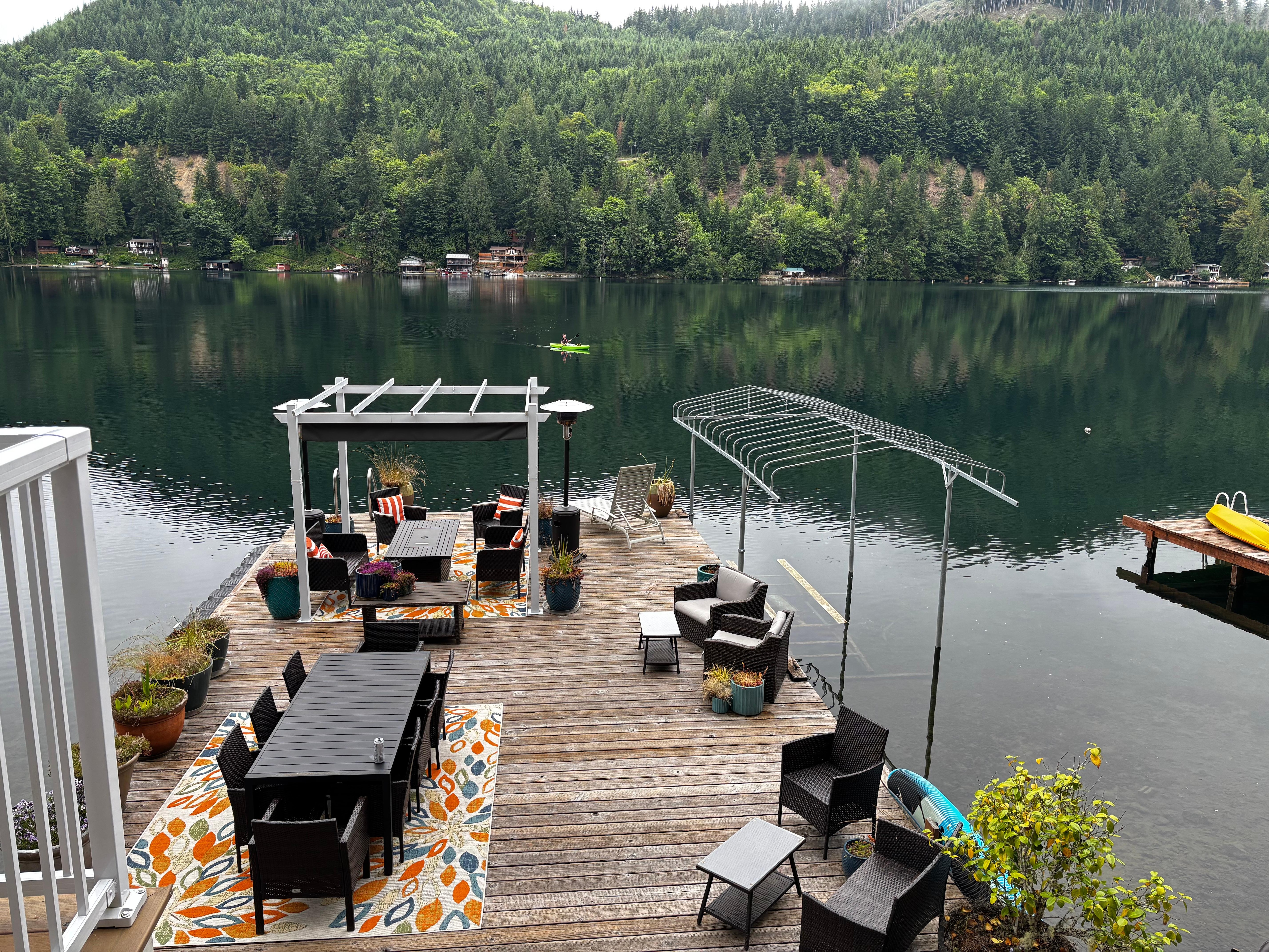 The huge dock has multiple seating areas for soaking up the sun and enjoying conversation. We provide a paddleboard and 2 kayaks for enjoying the water during the summer/peaktime months of May - October. The outdoor patio is equipped with a gas BBQ grill and food prep area. There's even a full bathroom on the dock level for your convenience with entrance from the outside. We also have a shallow "beach" entry to the Lake for wading and swimming, perfect for the kids and for launching the kayaks/paddleboard. A few sizes in life jackets are provided but we always encourage you to bring your own to ensure the best fit.
