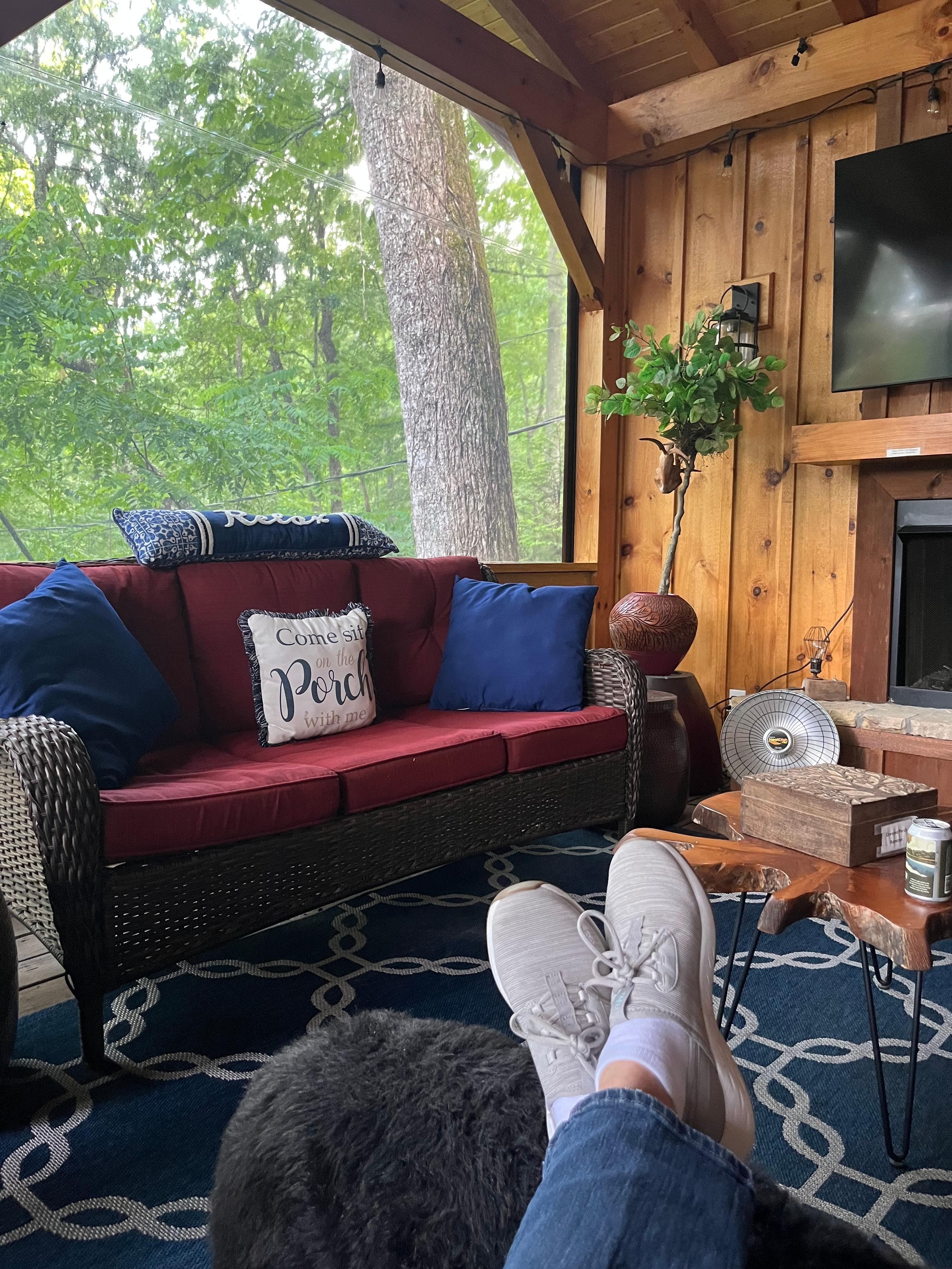 At the red birdhouse, the winding driveway takes you up to the hill top private paradise with a winter mountain view, and beautiful N.C. hardwood trees while enjoying the awesome wrap around party deck and giant covered porch! There is plenty of seating on the deck with an umbrella table and chairs, an 8 person picnic table, sofas and swivel cushioned chairs! Fire up the Gas Grill and cook out with the lighted torches, the remote control fireplace and TV , and enjoy an atmosphere compared to none at night!