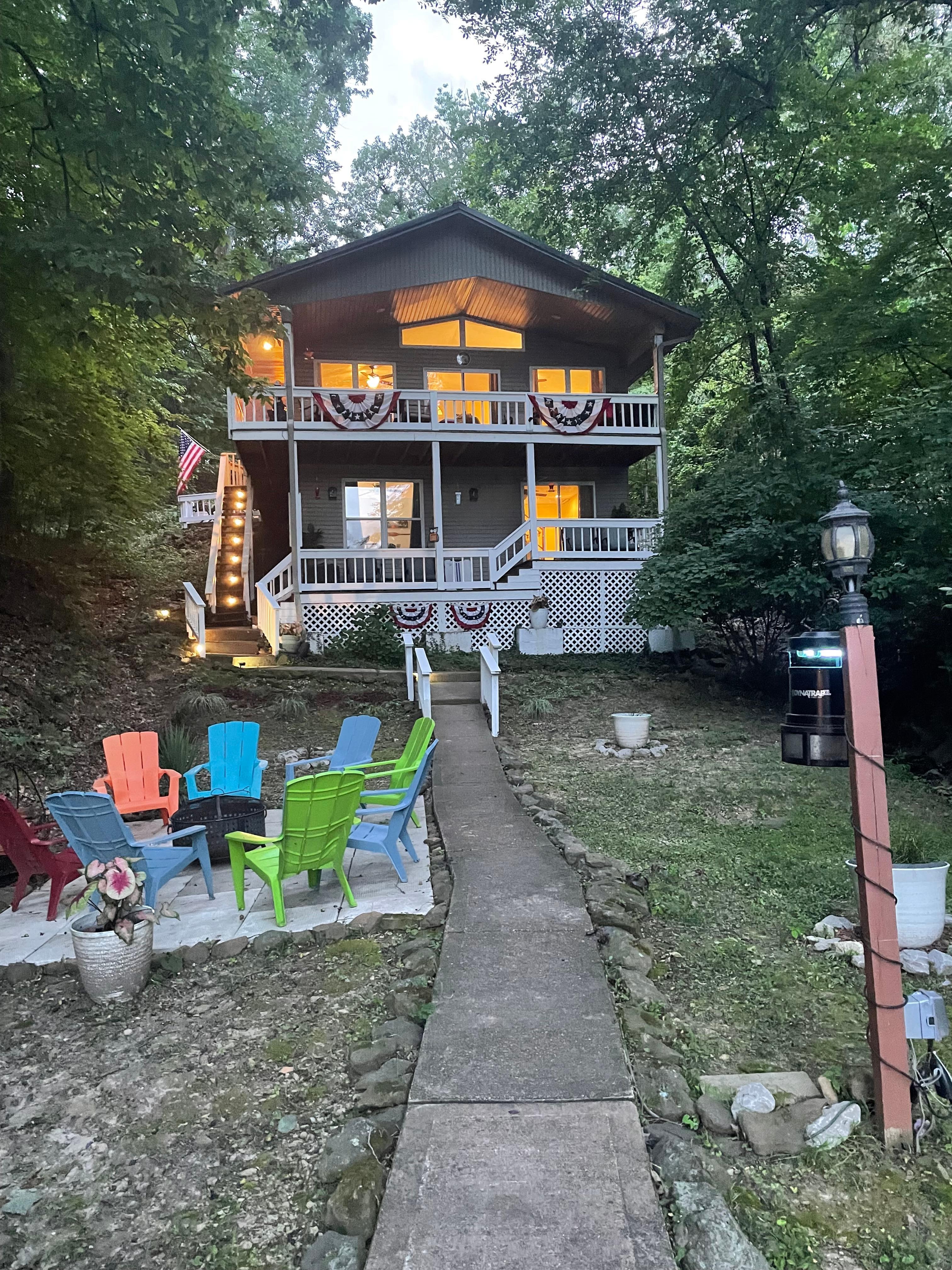 This secluded inviting, newly updated lakefront chalet boasts 3 bedrooms with USB charging ports, ceiling fans, 2 full baths, open concept, including a well-appointed kitchen with complimentary refreshments, snacks and coffee bar. A welcoming vaulted great room and lower gathering area. Desk workspace with ample plugs,USB's and task lighting. New paint, decor and furnishings throughout makes this chalet the perfect relaxation getaway. The upper and lower levels each have a wall of glass sliders providing stunning lake views and access to the covered upper and lower furnished decks including a large electric grill and Blackstone griddle for use in all seasons. This property includes ample parking with additional parking adjacent to the chalet, well-lit sidewalks and stairways which may be turned off to enjoy the evening under the stars. The outdoor space is just as amazing as the chalet, located in a lush wooded valley with deer, geese, ducks,birds, occasional eagles, breath-taking sunrises and lake views which you may enjoy from one of the two covered decks or the private dock