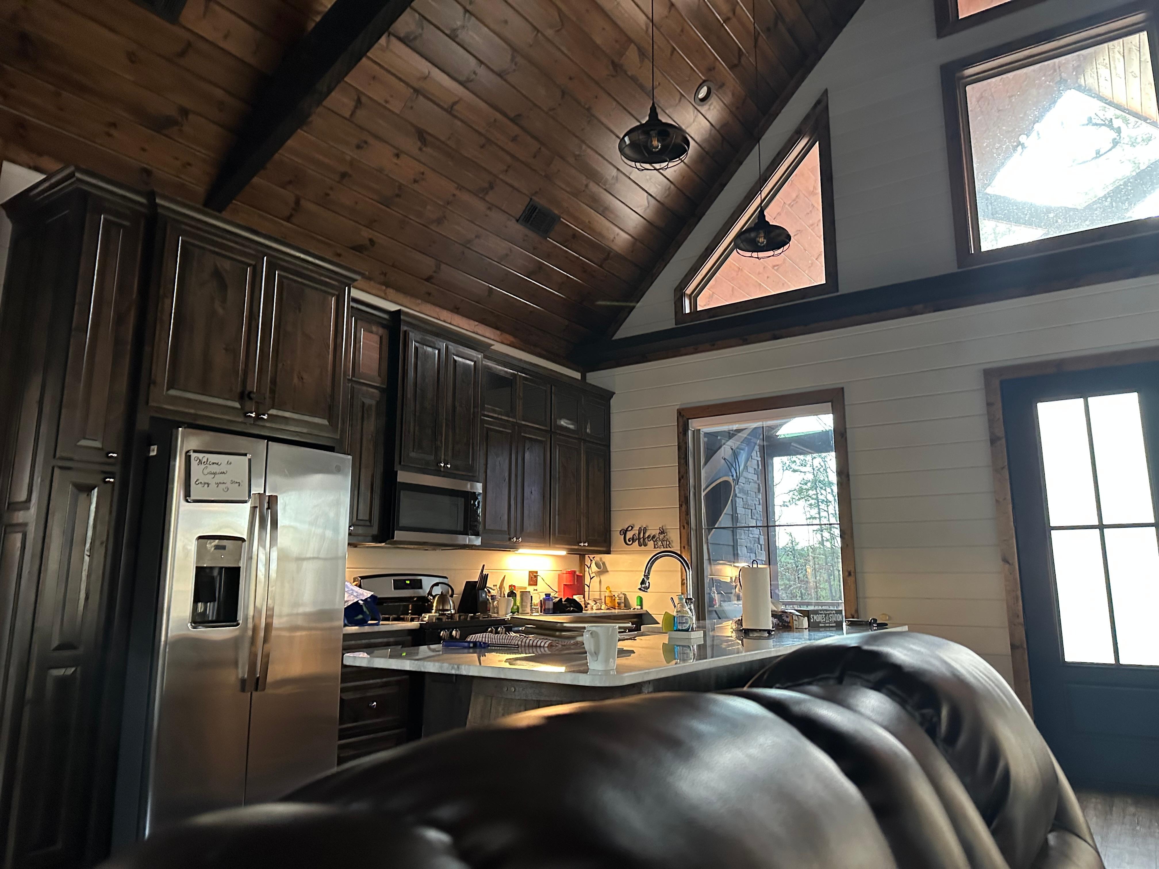 The fully-equipped kitchen has everything you need to cook a full meal if you choose to not eat out while in Hochatown. The quartz countertops and large farmhouse sink with the beautiful dark oak cabinets will make you feel like you're straight out of a magazine. There is plenty of seating for everyone at the kitchen table or at the kitchen island. Start your mornings off right at the coffee nook with your choice of pods coffee or bring your own to brew.