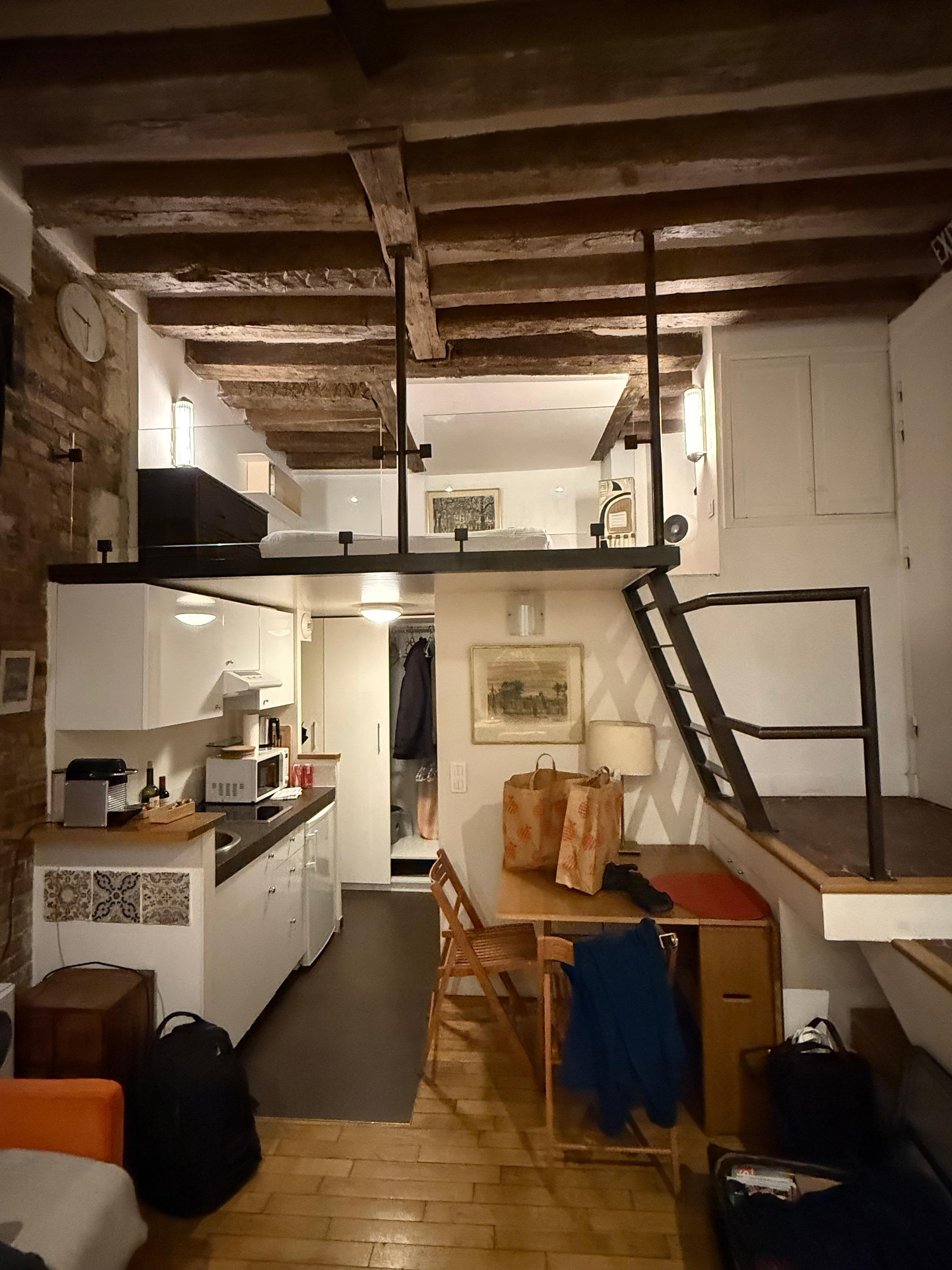 The mezzanine can be accessed by a stair running along the wall. Note : It can be used for sleeping only as it is not full body height and one can only stay seated on the bed. It is furnished with a double Futon (we limit rent to 3 guests. Ask specifically for 4 guests). Decoration is charming.