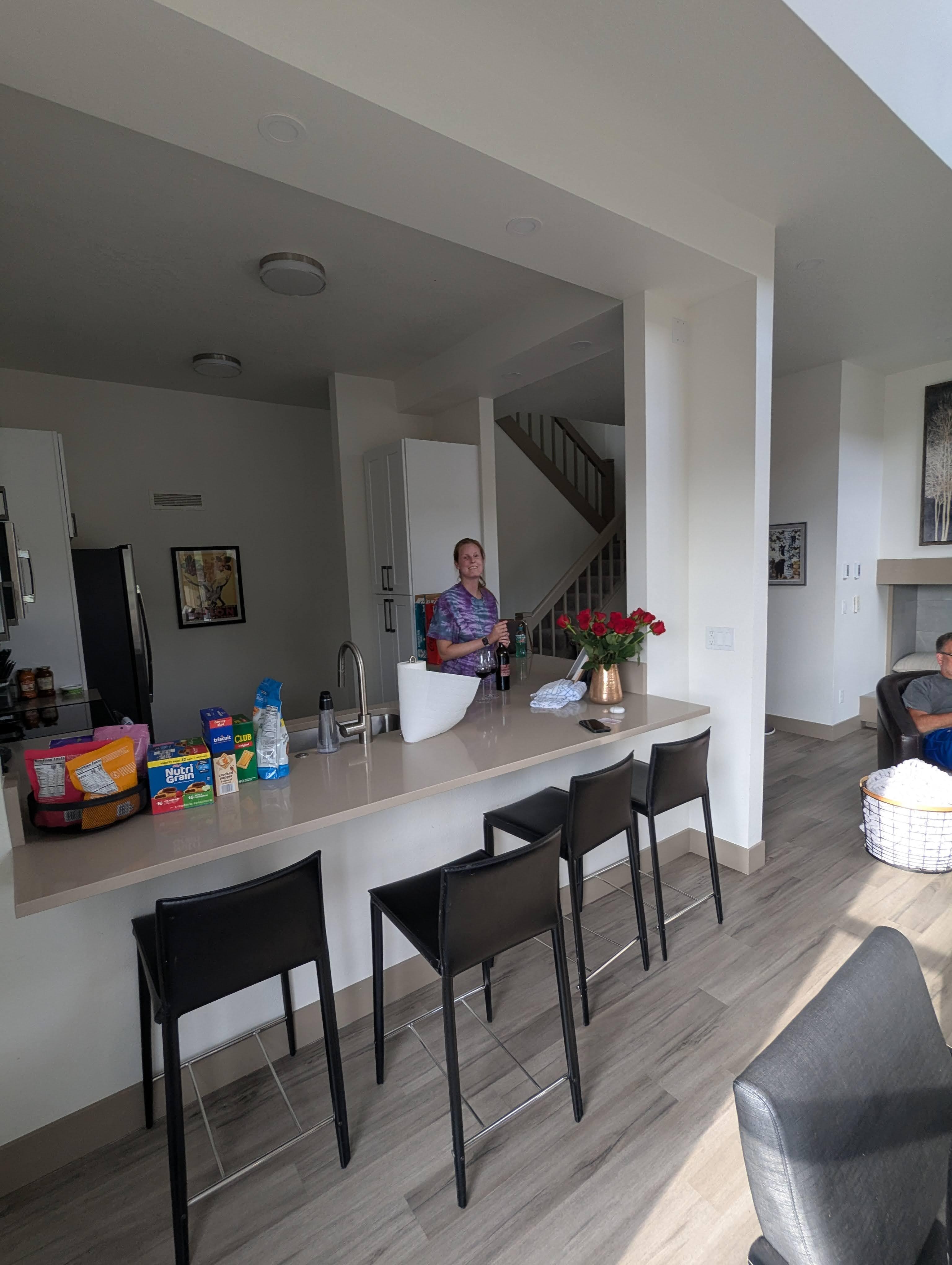 The full-sized kitchen is stocked with all the essential cookware and tableware to make a meal away from home. It features quartz countertops and updated stainless steel appliances. This kitchen is also stocked with household favorites including a crockpot, coffee maker, toaster oven, and a blender. Enjoy your home cooked meal at the dining table offering scenic views from the windows. The dining area comfortably seats four with four additional seats at the breakfast bar.