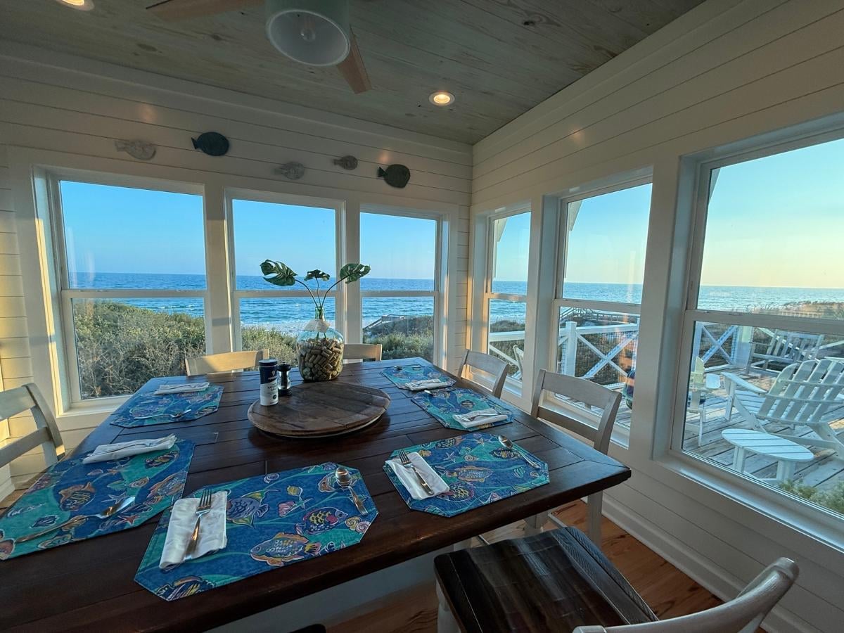 - Dining room with seating for 10, surrounded by windows overlooking the Gulf.