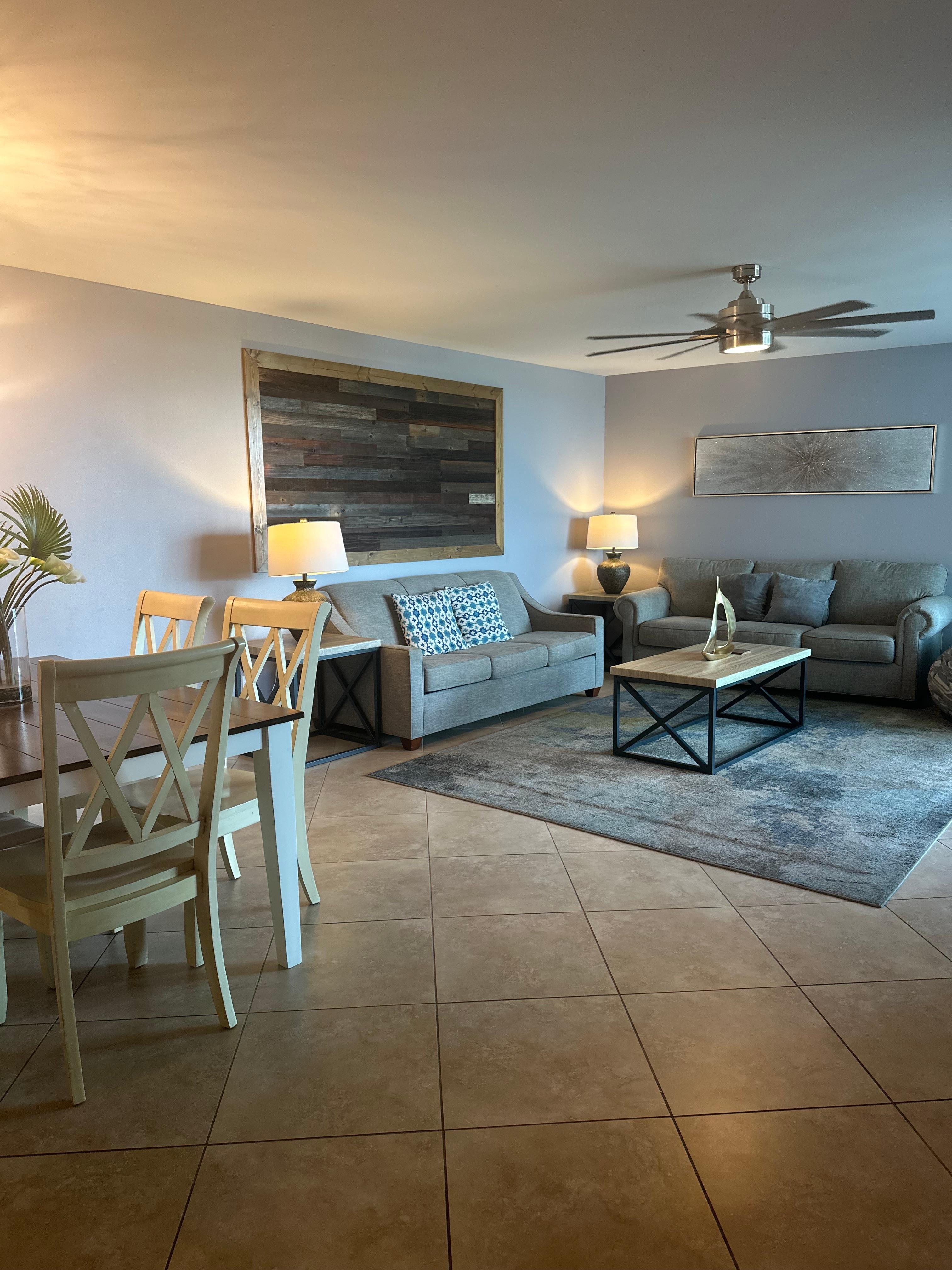 The single floor hosts the gulf-front balcony, dining & family rooms, kitchen, bedrooms, and laundry. Upon entering the front door, you will be in awe of the open floor plan, with the entry hallway flowing into the kitchen, dining area and family room. The dining area features modern chandelier lighting and provides seating for 8. As you continue into the family room you find custom reclaimed wood art on the left, and expansive Gulf Front views through the large sliding glass doors to the right. You can see the beach from the comfort of your own couch, which also pulls out into a comfortable Queen size sleeper bed. Enjoy a movie on the 70” smart TV in the family room – get cozy on the LoveSac or get comfortable on one of the two couches! Take in the phenomenal, upfront Gulf views and relax after your day at the beach!