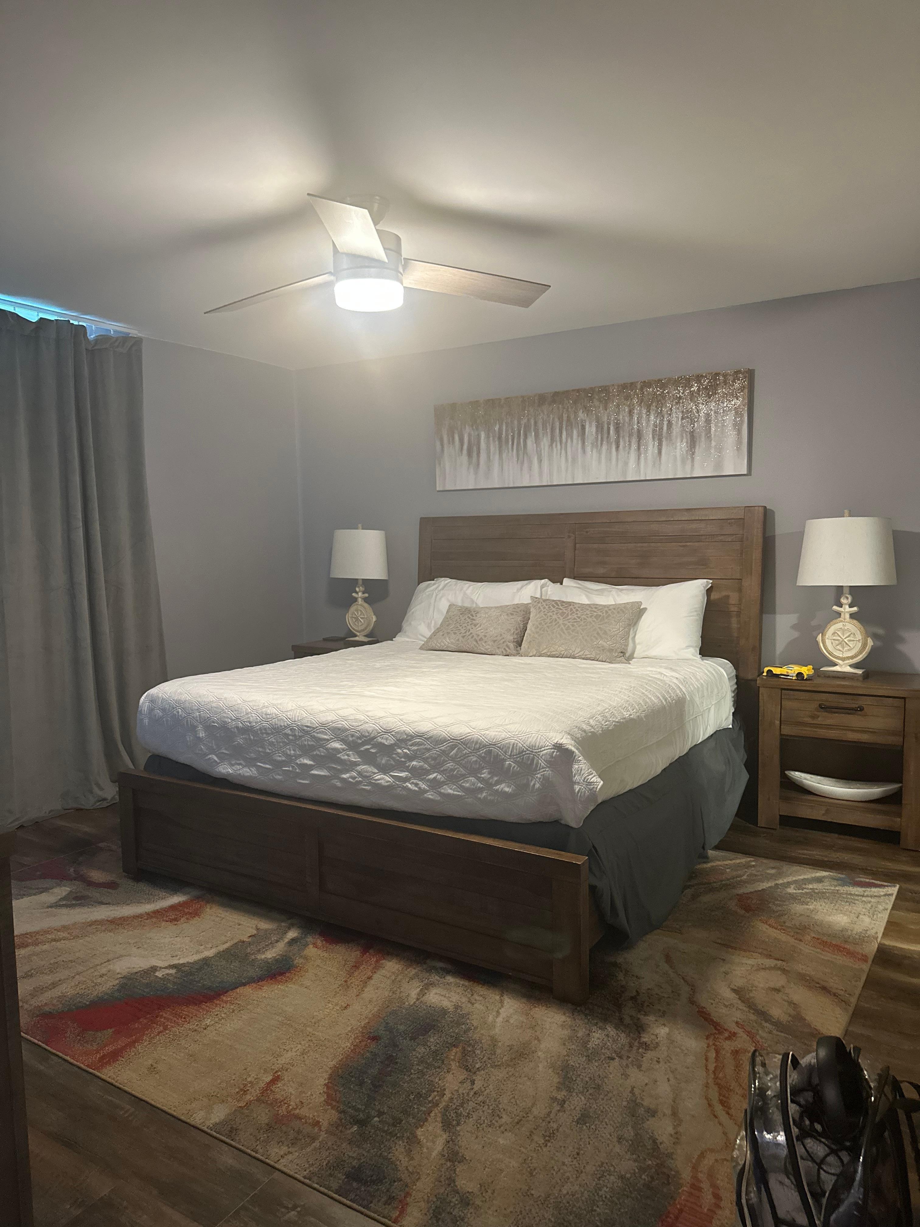 Bedroom with King bed, private bath with shower / tub and shower glass, 50” SMART TV