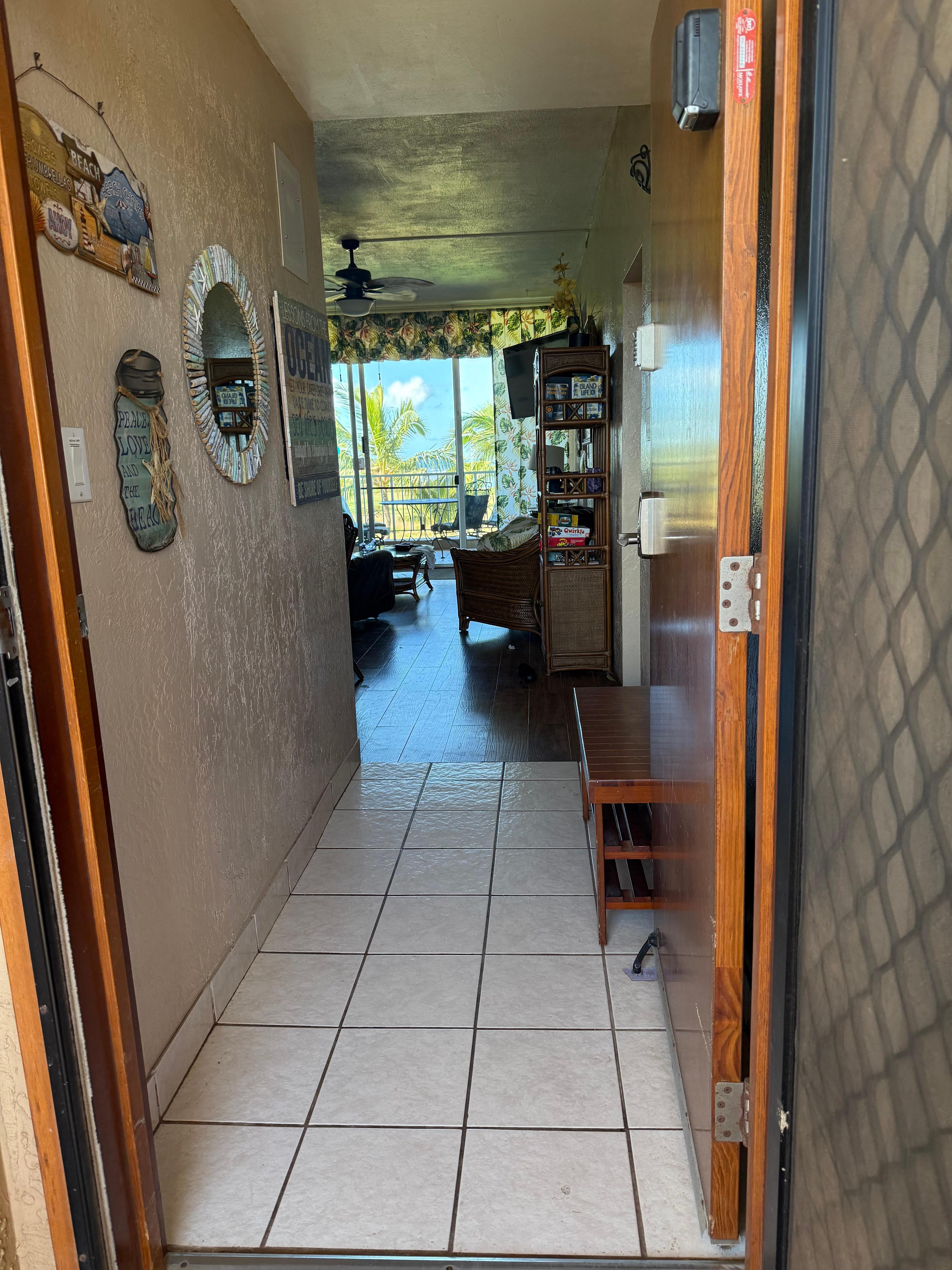 This Menehune Shores Condo is unit #620 and is an oceanfront/oceanview penthouse, which has 885 square feet with two bedrooms and two baths. The master bedroom is on the oceanside of the building and has a King-size bed. The second bedroom has a Queen bed plus a pull out twin and there is a sofa bed in the living room. Towels and linens are provided. Since it is a penthouse condo, it has higher ceilings (than the lower units) which provides a very spacious feeling.