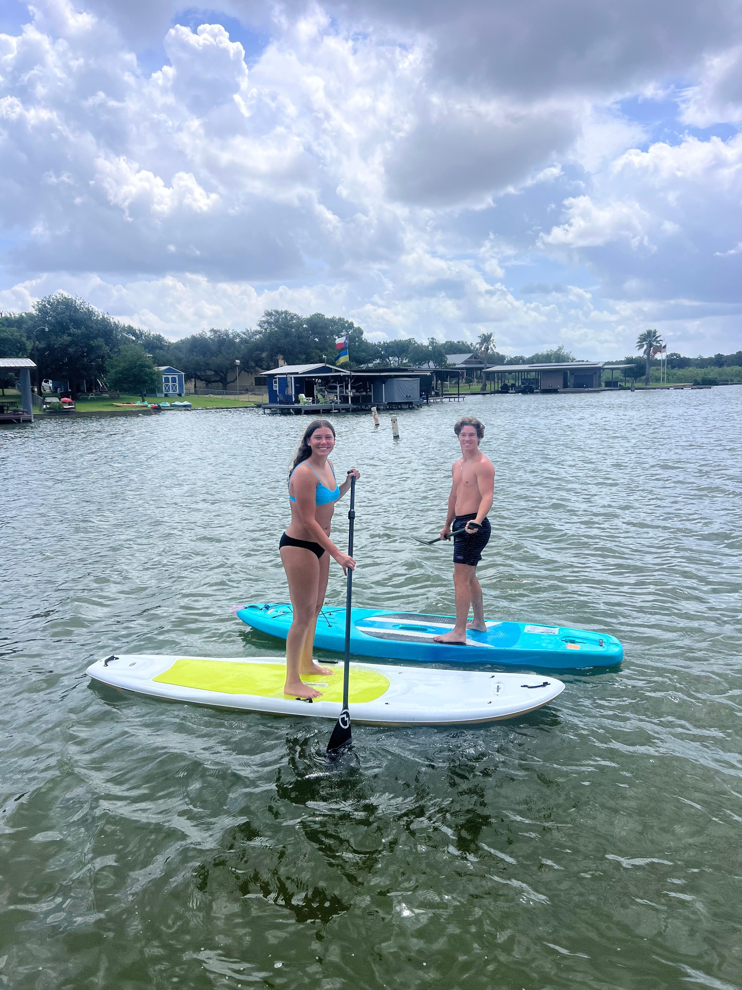 This family friendly lake house is on a large, peaceful cove of Lake LBJ in Granite Shoals, Texas. Lake LBJ is one of the largest constant level lakes in the U.S. and is ideal for water-skiing, jet-skiing, boating and fishing. The lake house is in a no wake zone in the cove which is great for swimming and docking boats and personal watercraft. Guests love the super-sized boat and fishing dock. The oversized dock has plenty of room for everyone and is the perfect spot for swimming, sunbathing, fishing, dancing, or just relaxing and enjoying the activity on the lake. The dock also has a water slide or you can have fun kayaking and stand up paddle boarding. Please bring your own life vest and lake towels. The water near the shore is shallow enough for smaller children to wade and gradually gets deeper.