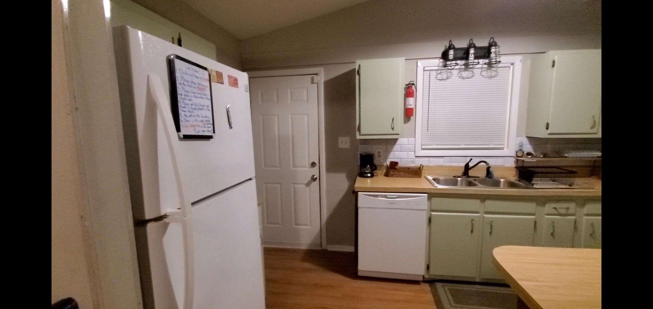 Two bedroom duplex with full kitchen that is stocked for cooking any meal. Laundry room area has full size washer/dryer across from bathroom.