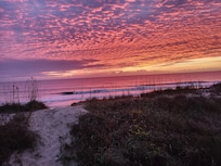 Just a few steps to this quiet part of the beach in South Nags Head. Come enjoy the breathtaking views of the ocean from this 4 bedroom, 4 bath home! The rooftop deck provides panoramic views while the covered deck below provide relief from the sun while still watching the waves roll in. There are two primary suites with attached baths and two other bedrooms with their won dedicated bathrooms accessed by the hallways. Enjoy your coffee with the sunrise from the covered porch and sunsets from the huge rooftop deck with your family. Under the home, enjoy the hot tub along with lots of fun hammock chairs. Steps to the ocean for family fun!