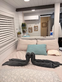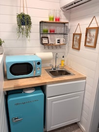Our mattresses were custom handmade locally from Cantwell Mattress in San Antonio. These mattresses are made in Texas with 100% All-Natural Cotton sourced in Texas. Our shampoo, conditioner and body wash are made with 100% Pure Morocco Argan Oil and are 100% Vegan & Cruelty-Free. In addition, our hand soap is made with essential oils, aloe vera, olive oil, and without parabens, phthalates or artificial colors. We have provided everything you need in our kitchenette, including a corkscrew and wine pourer to enjoy your Texas Hill Country wine.