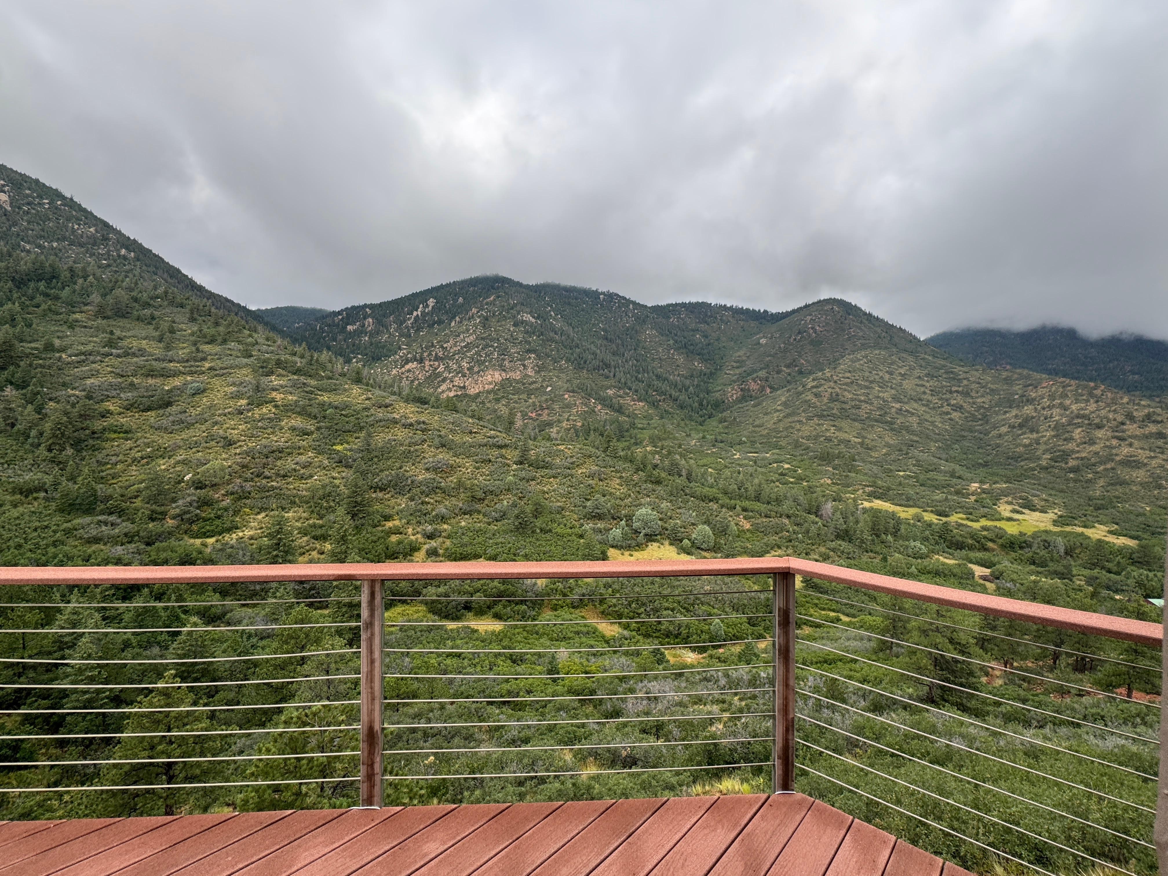 Enter the home on the main level, with large windows offering you a panaramic view of Pikes National Forest. This open living space includes a fully stocked kitchen, dining area, and living area with a wood burning stove. Your group will love spending time together in this space. On the main level you also have access to one bedroom, a full bathroom, office, and a balcany overlooking the sprawling trees and mountain views. Down to the lower level is a family/movie room with a cozy couch in view of 55” Smart TV ready for streaming. The lowest level has access to the back patio, and additional 3 bedrooms and two full bathrooms.
