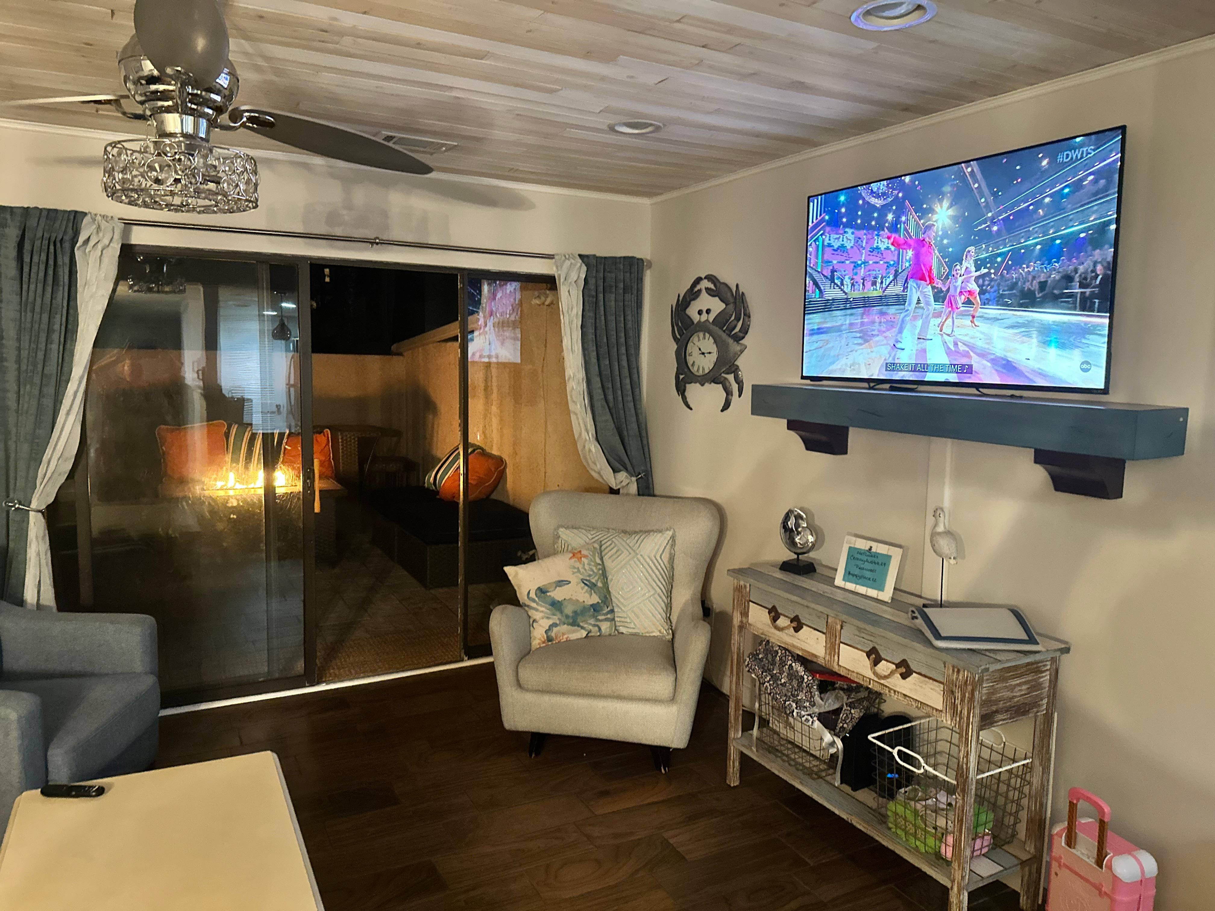 A cozy living room with a pull-out sofa sleeper and large Smart TV