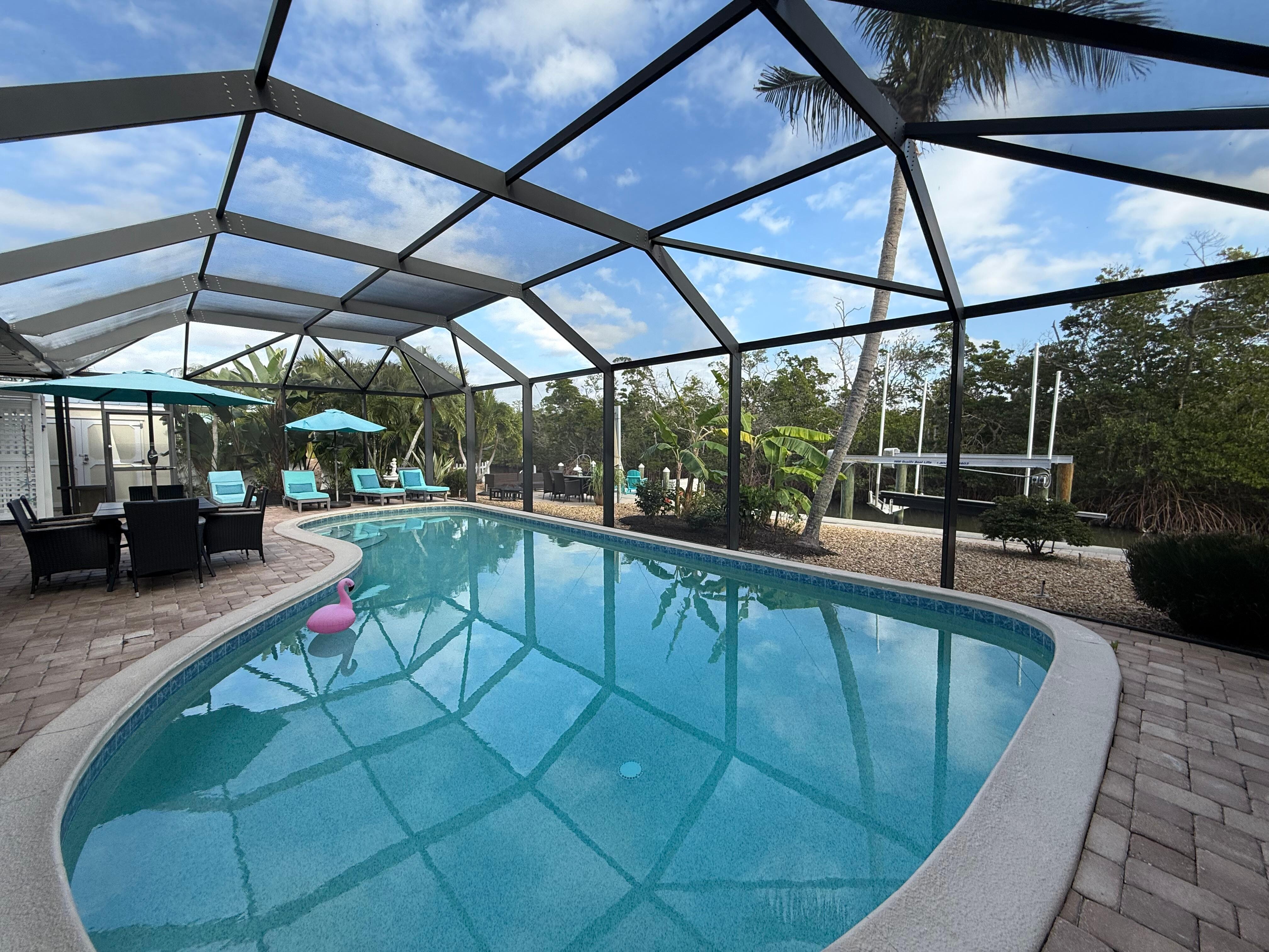 The outdoor area features two lounge chairs, sofa seating with fire pit and additional dining table by the water so you can easily watch for manatee or dolphins.