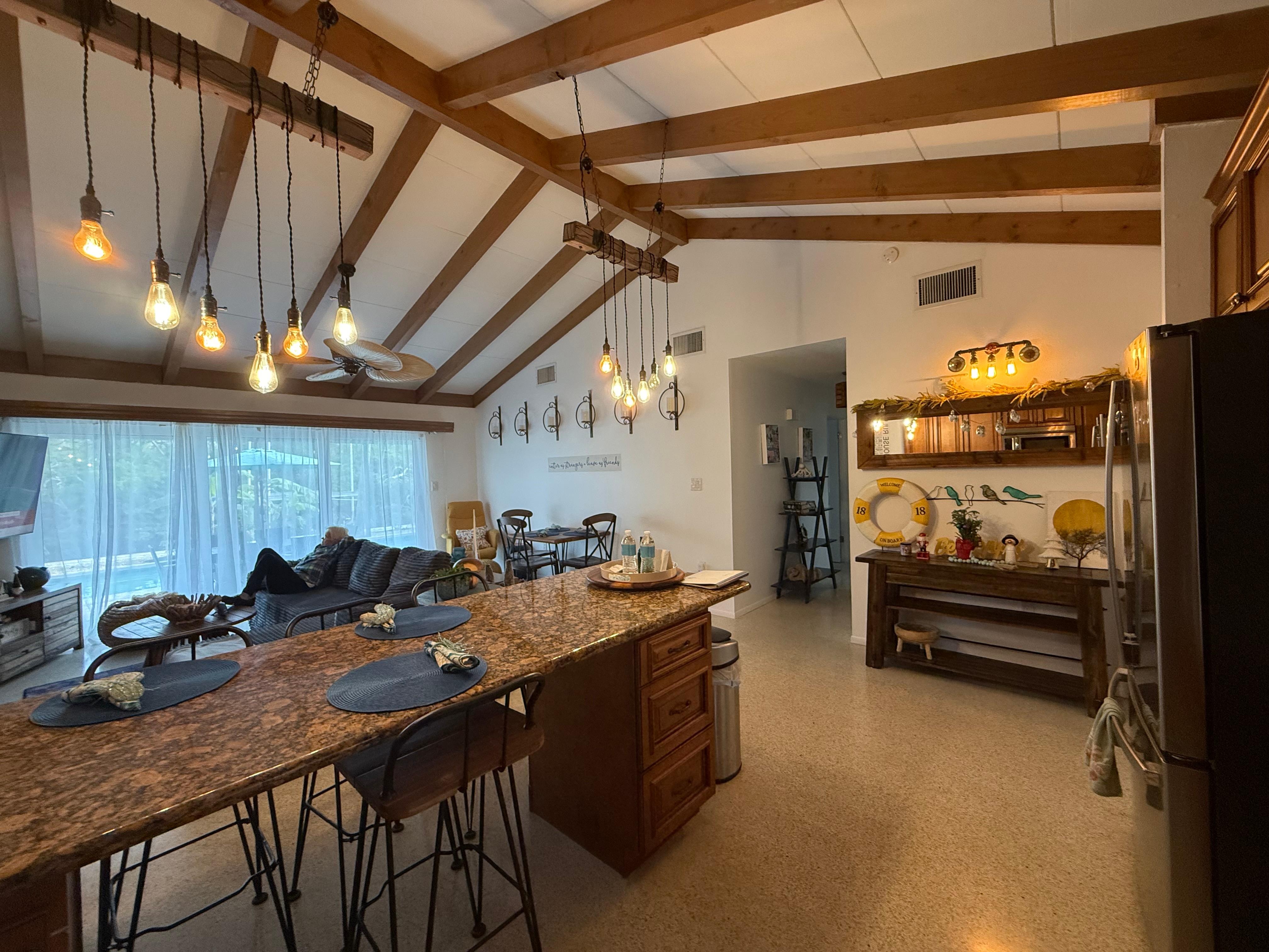 Our first impression upon arrival was that this was like an HGTV house with everything perfectly placed within a notable beach design theme. Everything within the fully supplied house was new, almost new, or very clean. Even the landscaping was eye pleasing and well maintained. The location or the north side of the island is nice if you want a bit quieter and neighborhood feel away from the condo complexes. Neighbors in the area are very friendly. If you have a small boat, it is perfect with a lift. One issue that LBK needs to address that is out of the owners' control is the red tide. It limits the beach use on certain days. Good thing that the property has a very nice pool set up. Special surprises were the awesome foam mattresses in each bedroom and the availability to explore the local canals with kayaks. The owner was very responsive and helpful for tips. Really nothing negative to post after staying over a month. Would recommend for a small family. We cannot wait to visit again to this small slice of paradise.