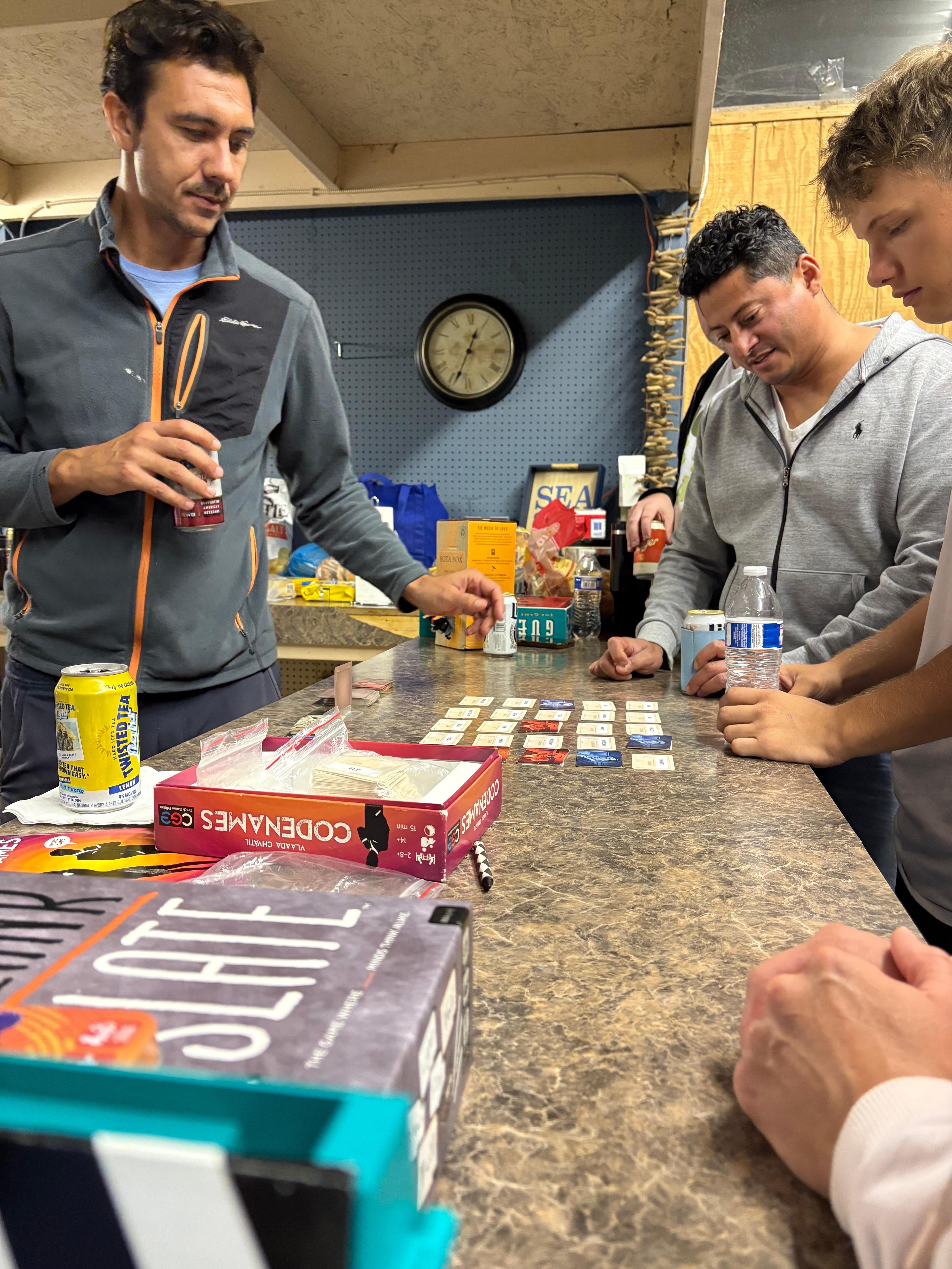 This lake-themed indoor/outdoor meeting space is set up as a gathering place for food, games, & movies!