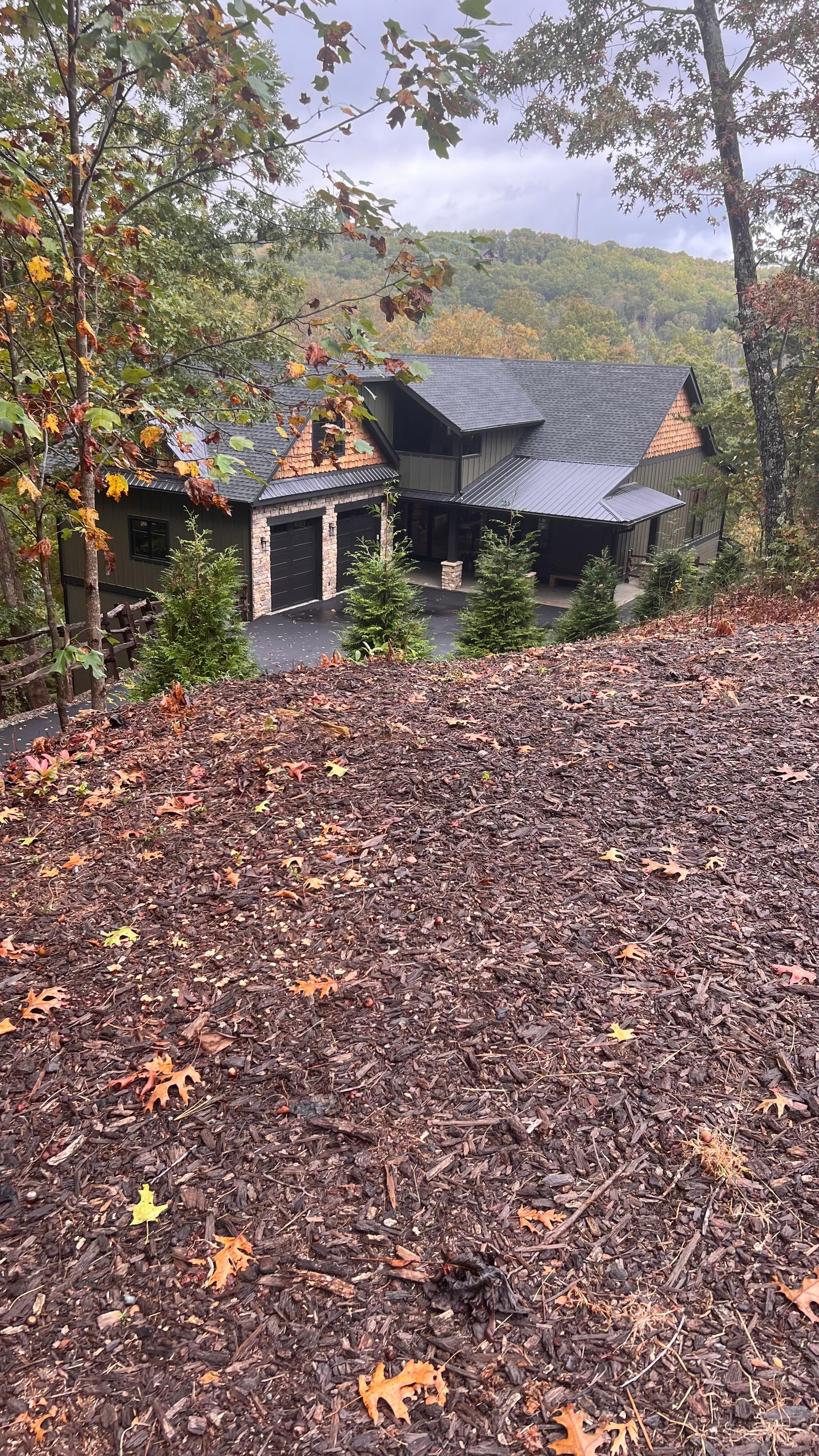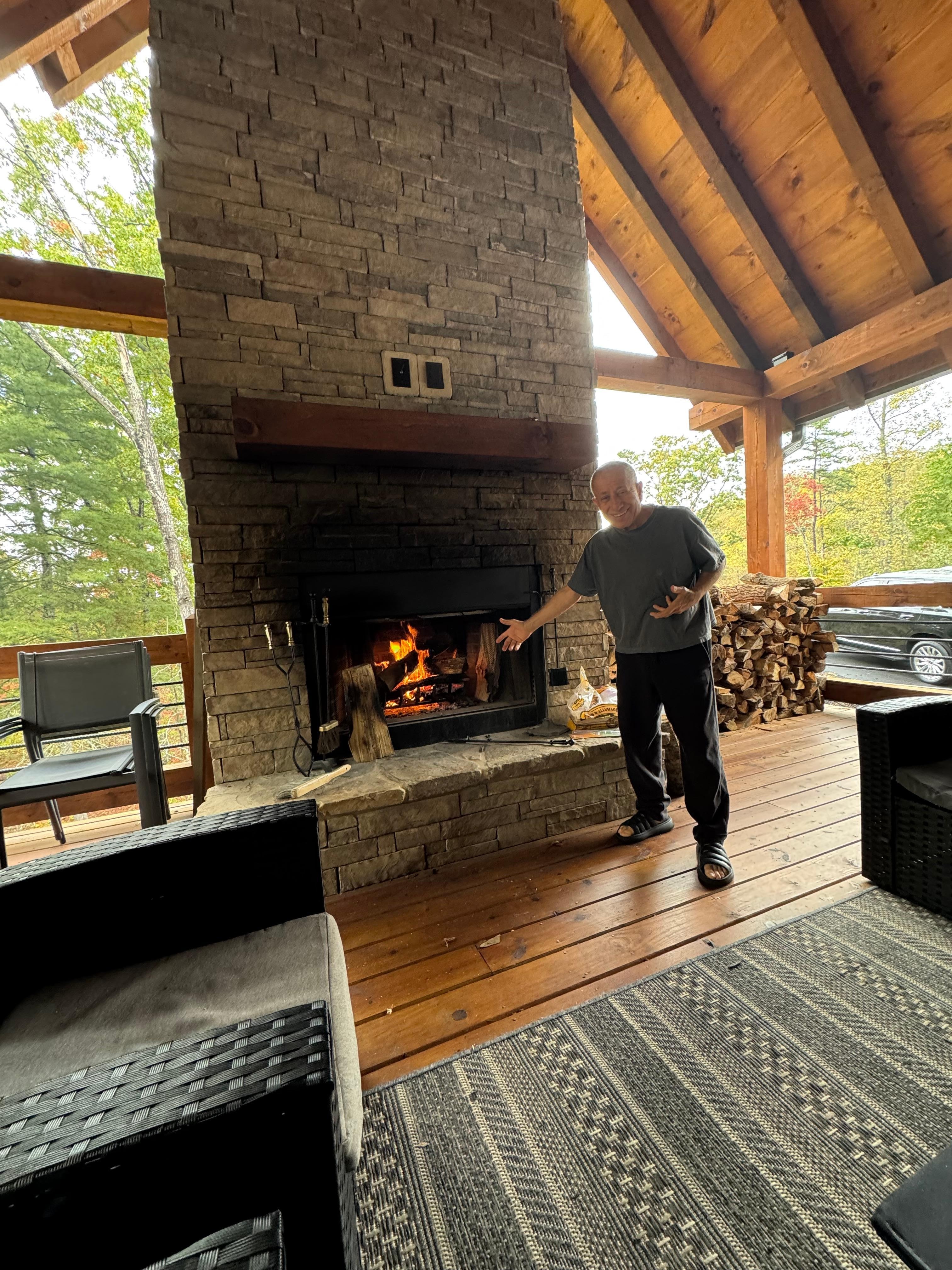 Mountain views • 2 covered decks • main level covered deck features patio seating & porch swing, wood-burning fireplace • uncovered main level deck features dining set & propane grill OR griddles • Lower level deck features zero gravity loungers, cafe dining sets, gas log fireplace with 65" TV, hot tub, giant chess • outdoor fire pit (bring your own firewood) • private putting green