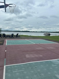 150’ of shore line, private pickleball court, basketball court. Large fire pit.