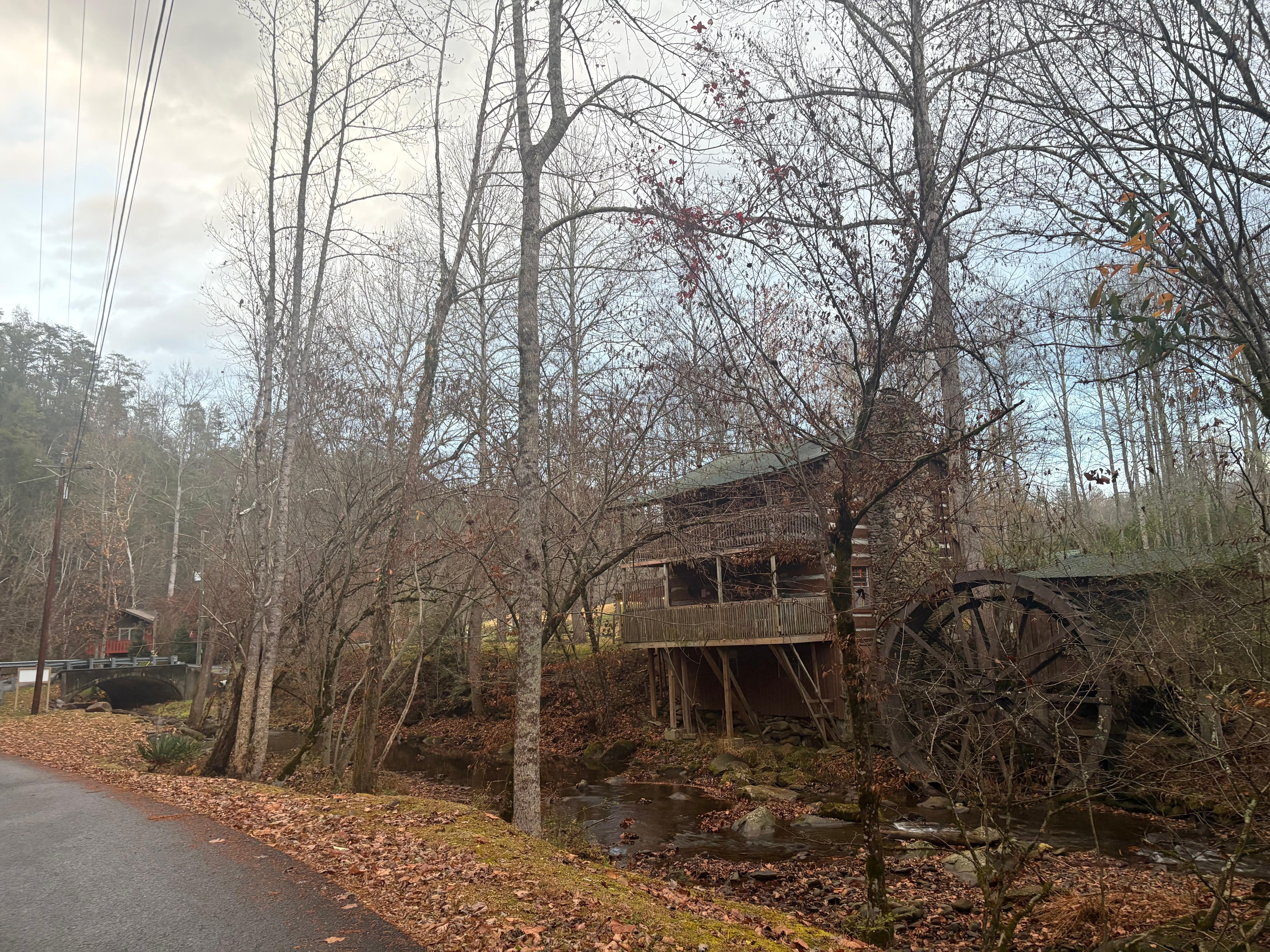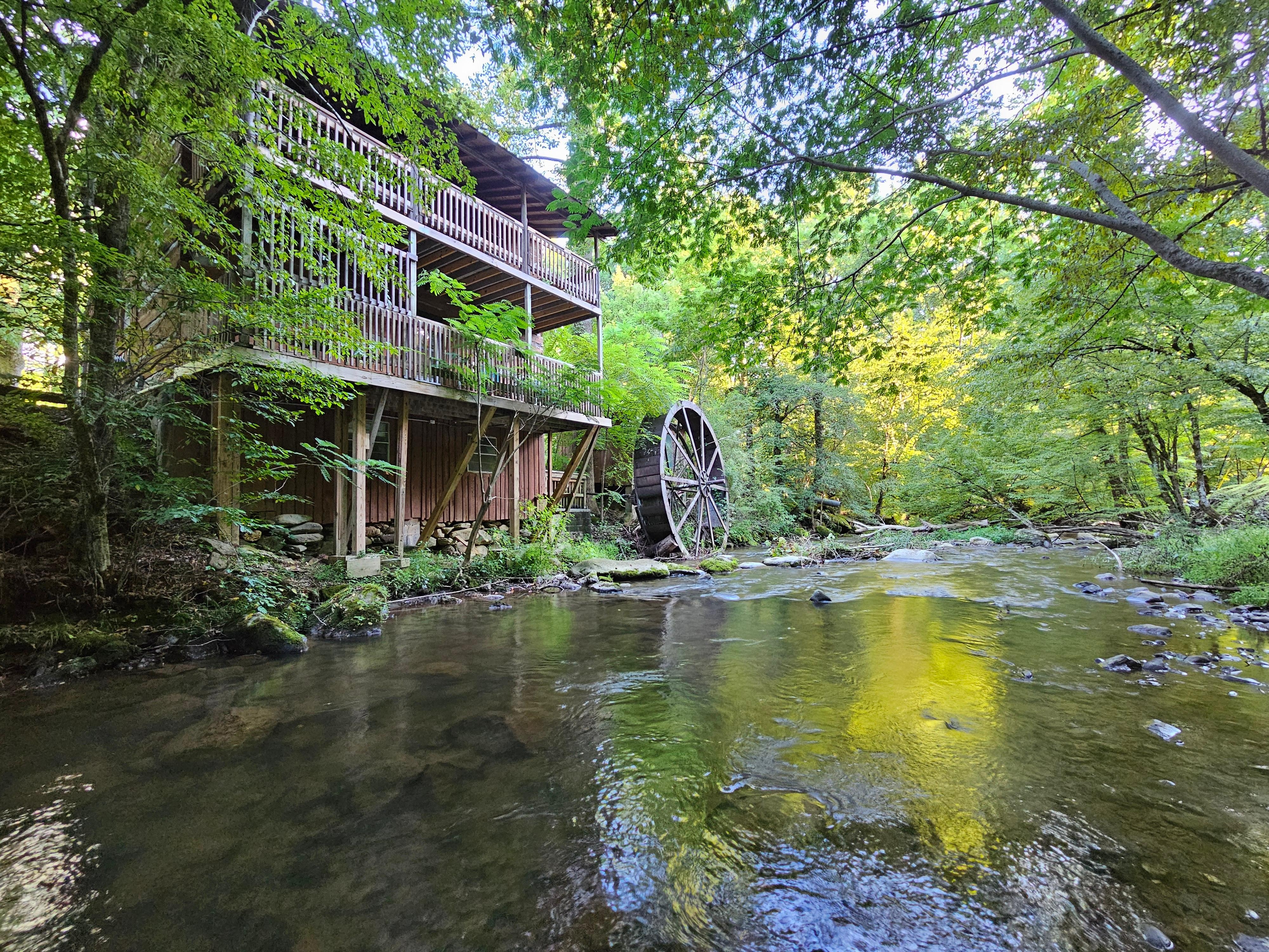 As seen on the Travel Channel! An authentic 120 year old log cabin and grist mill directly between a trout stream and a catch and release pond! You can relax on the 3 level acres. This cabin offers all the comforts of home with 2 wood-burning fireplaces including the upstairs master bedroom, hot tub with cafe lights under a gazebo steps from the creek, charcoal grill, smart TV, Xfinity wifi. Rockers on the front+back porches. Easy access, no mountain roads! Come enjoy the quaint solitude of East Gatlinburg.