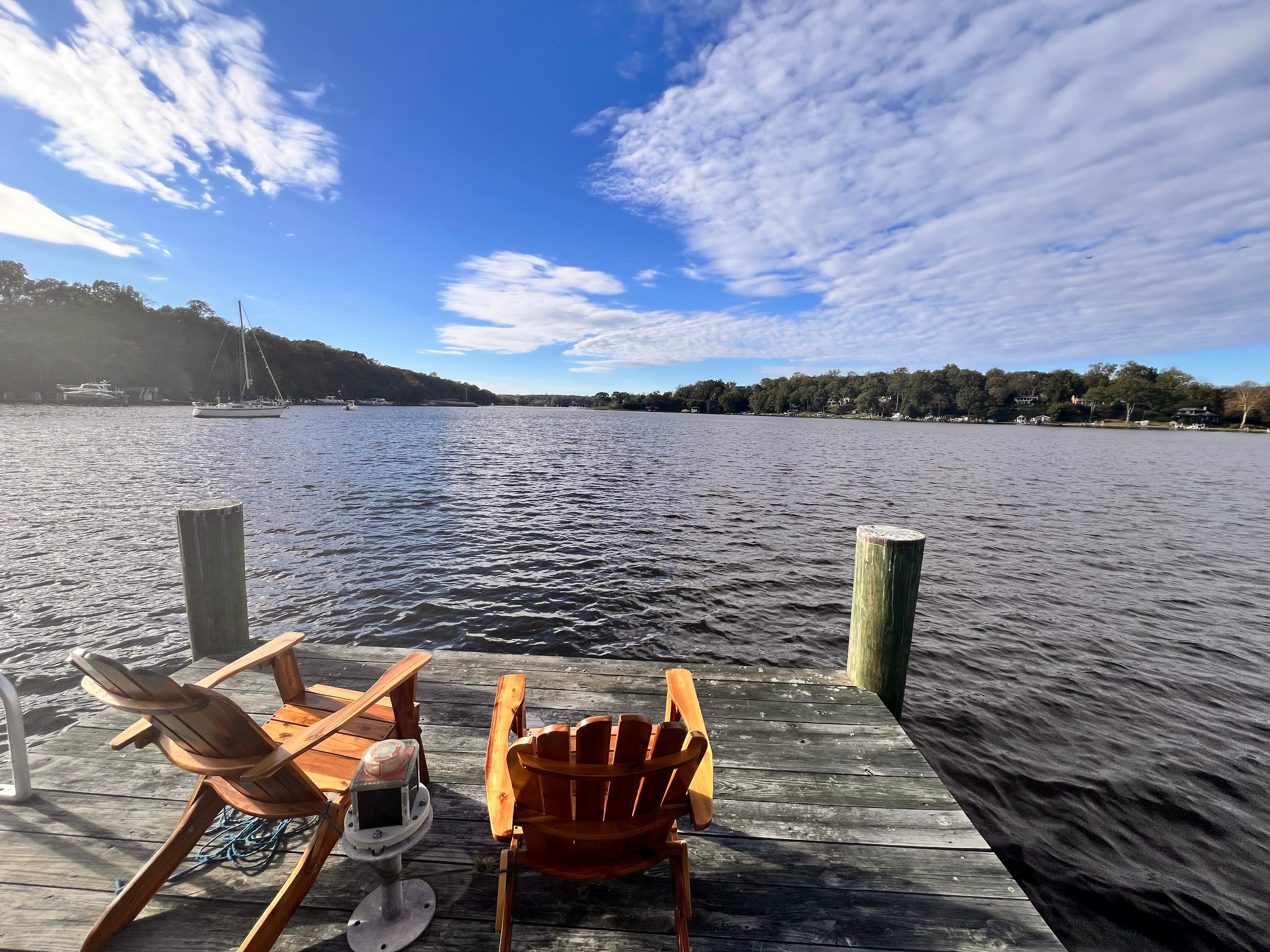 The back of the house opens up to the spacious dining room/gourmet kitchen combo with stunning water views. The high-end finishes in the kitchen are ideal for the chef on vacation and the blue finishes make the kitchen feel like an extension of living by the Severn. The dining room has seating for 8 with additional seating for 3 more at the breakfast bar. Walk out the back door of the kitchen to the fully-furnished deck, overlooking the private backyard and pier. Take a stroll down past the chicken coop to another furnished deck and private pier.