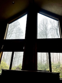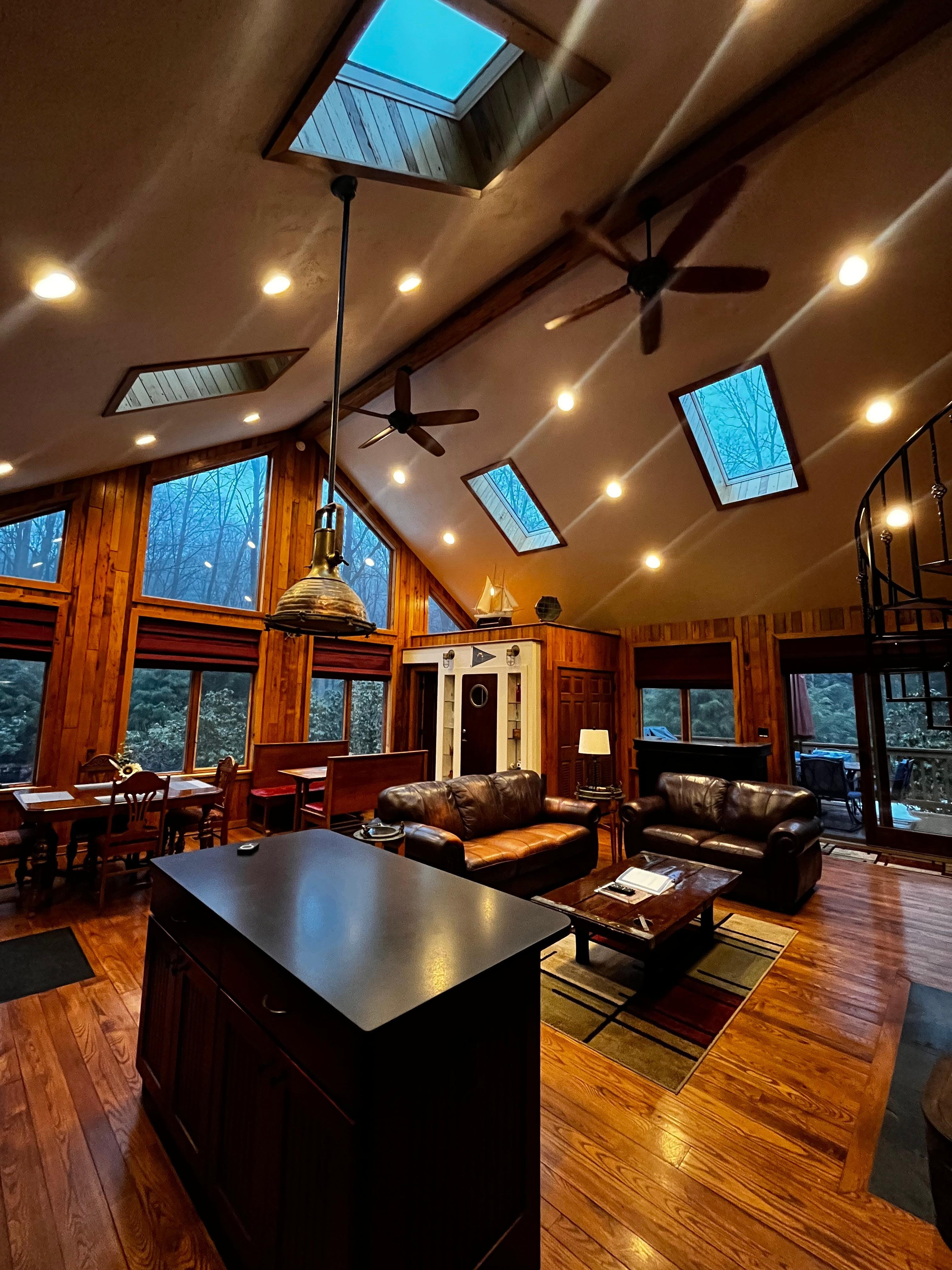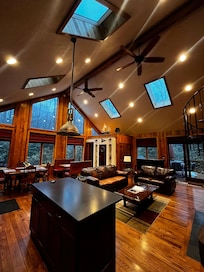 Large windows with skylights for the forest view and you can even step out from the primary bedroom onto your own private deck attached with a hot tub.