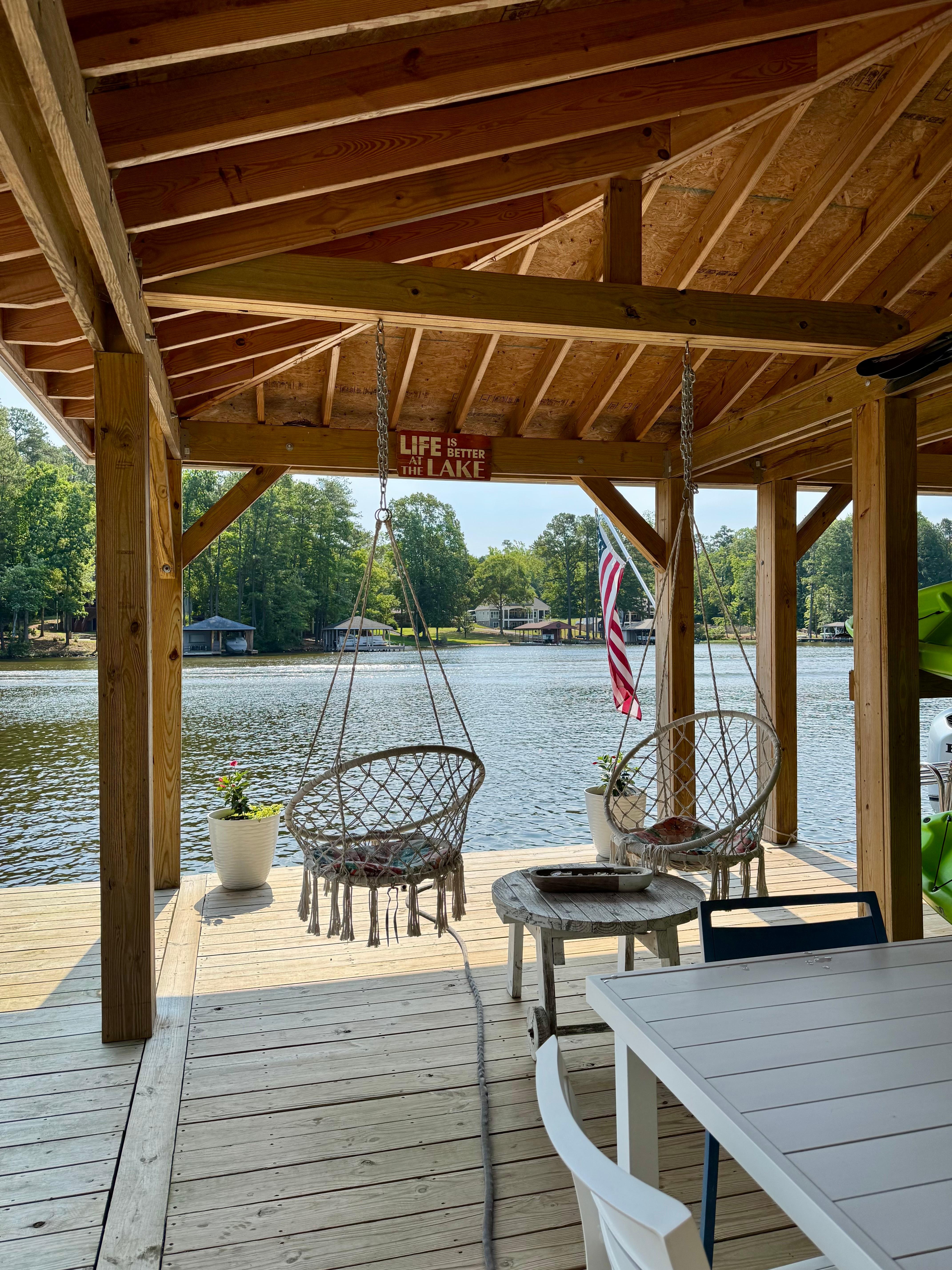 Outside you will find a large dock with a new Weber Gas Grill, seating for 16 and 180 degree views of Lake Gaston. The backyard is grassy and flat with plenty of space to play games like Badminton or Cornhole, or to toast s'mores at night, and is an easy walk to a private dock where you will find kayaks, fishing poles, floats, and life jackets (including kids sizes) for your enjoyment on the water! The dock is located in a quiet cove with 10 ft of water, making it perfect for jumping and swimming, and has a SmartHDTV and plenty of seating to enjoy football in the Fall.