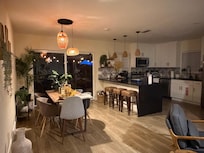 Dining table with seating for up to 6 people + additional seating at large kitchen island