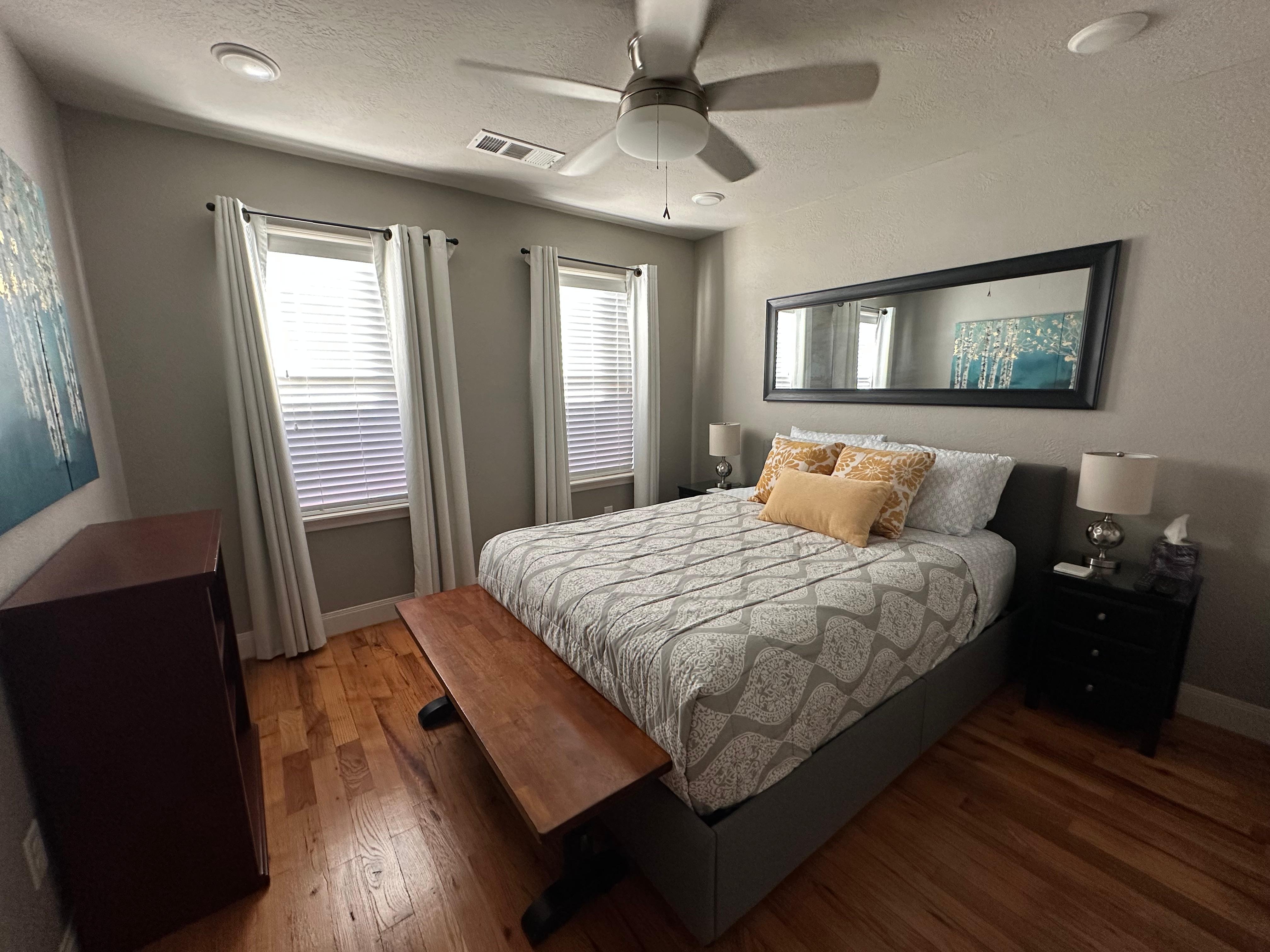 there are two fully appointed bedrooms, one with a king bed and one with a queen bed and luxury linens and pillows! Each has a luggage holder, a full walk-in closet with a built-in chest of drawers for your belongings, bedside tables and lamps with USB plugs, 42 inch smart TV, and central heat and air conditioning!