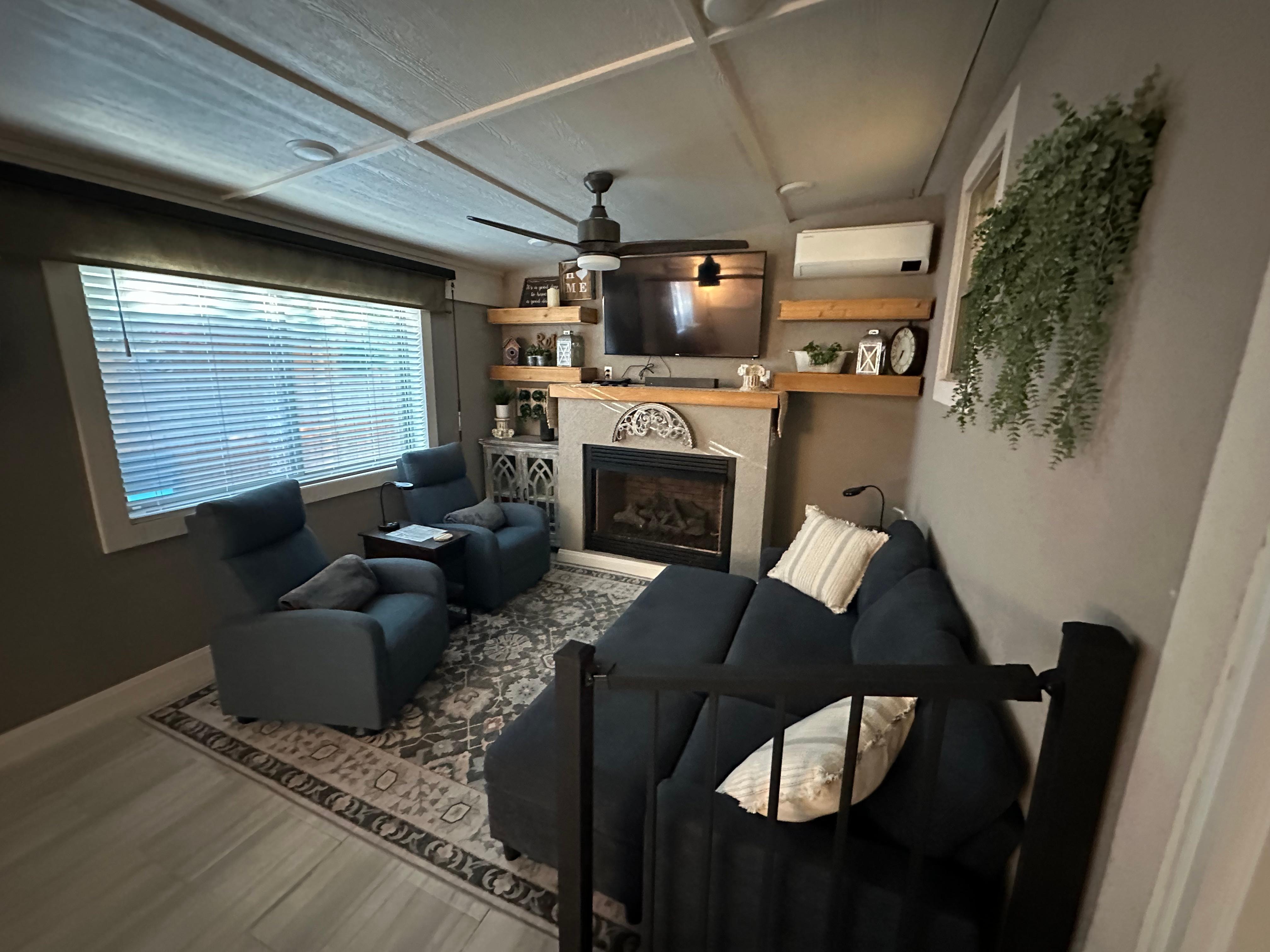 The open concept living area has two recliners, a couch that can pull out into a full lounge position and has a gas fireplace for those cozy winter and fall vibes with just a flick of a switch! There is a 60 inch smart TV above the fireplace that can be viewed from anywhere in the living room/kitchen for an all-inclusive feel!
