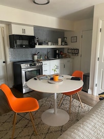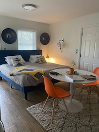 The Studio has a fully stocked new kitchen and full private bath. The twin beds can be separate or put together to make a king size bed. Perfect set up for one or two people or a couple. Please let us know your preference.