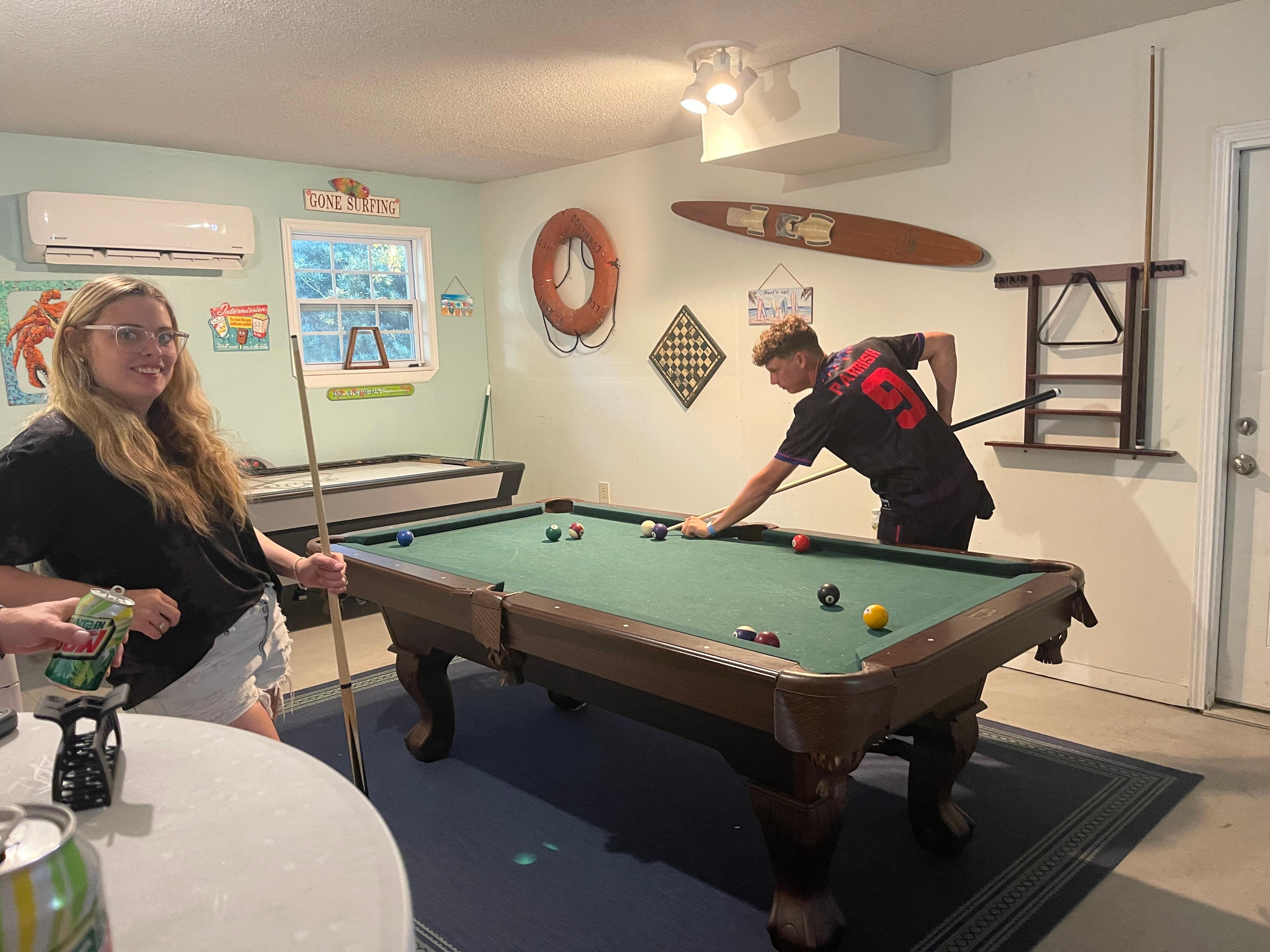 When you step in the downstairs area, you’ll see the large living room with 55” SMART TV mounted on the wall and the seating surrounding it so there’s plenty of room to relax and watch your favorite shows after a day at the beach. There’s also a queen sleeper for extra sleeping space. From there check out the large dining table with seating for 10. Family dinners every day! Next to that the large kitchen with new stainless appliances, granite counters and refreshed cabinetry. It’s ready for you to fix the family meals whenever you want. When the kids are done eating, they can head to the game room that’s equipped with both a pool table and an air hockey table. Let the games begin.