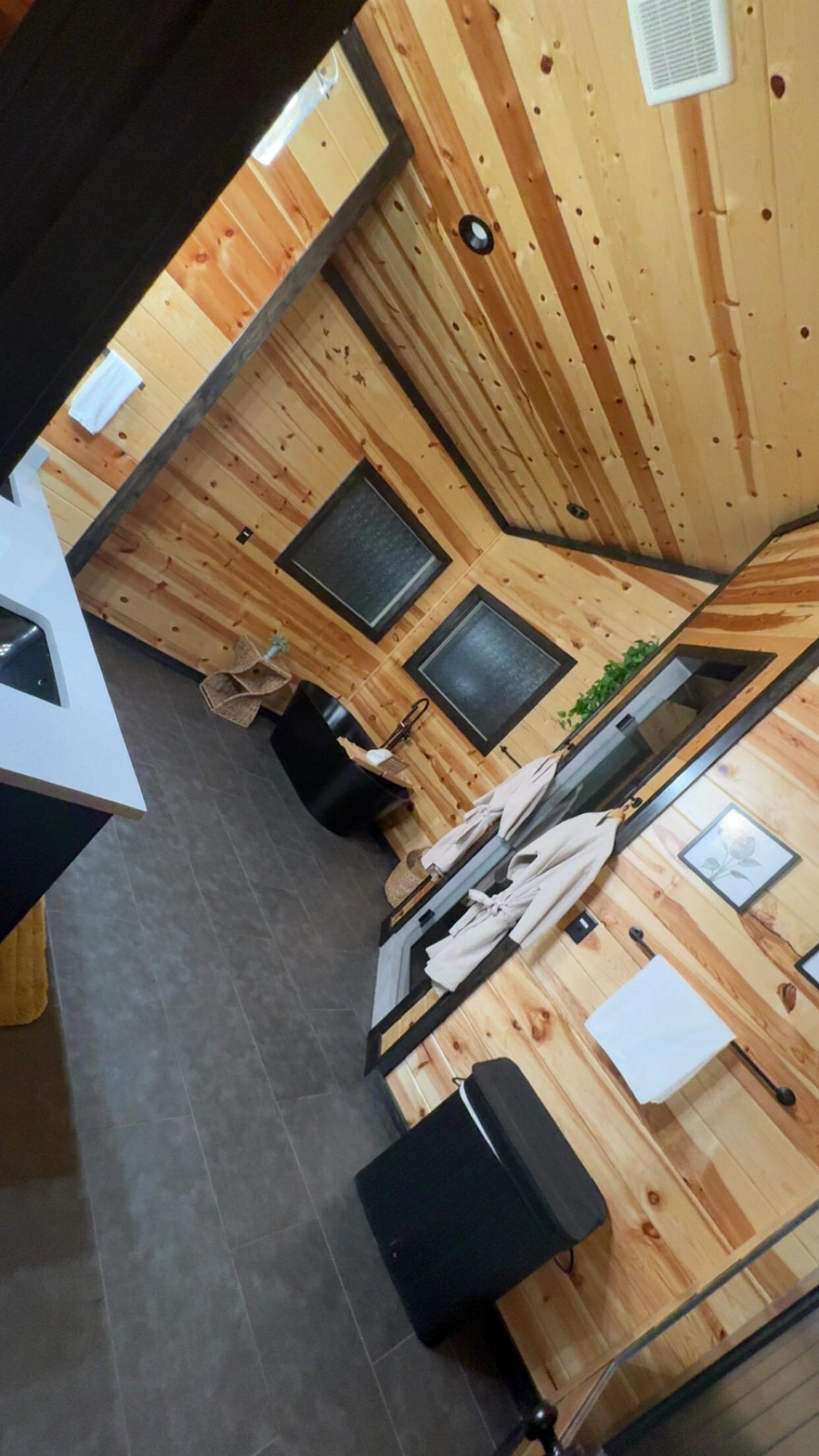 This modern and beautiful kitchen lacks for nothing. Enjoy the butler’s pantry which offers ample storage space for guest’s groceries (a rare find), and an extended kitchen island that seats 4. This cabin offers an abundance of counter space and cabinets which come fully stocked with all cookware and accessories to prepare any meal. We didn't stop at just basic cook wear. You will have the the extras to enjoy during your stay; XL air fryer, toaster oven, snack boards, cast iron skillets, bar accessories, whisky glasses and more. Located off the kitchen is a half bath complete with full size washer and dryer. Laundry pods and dryer sheets provided for guest.