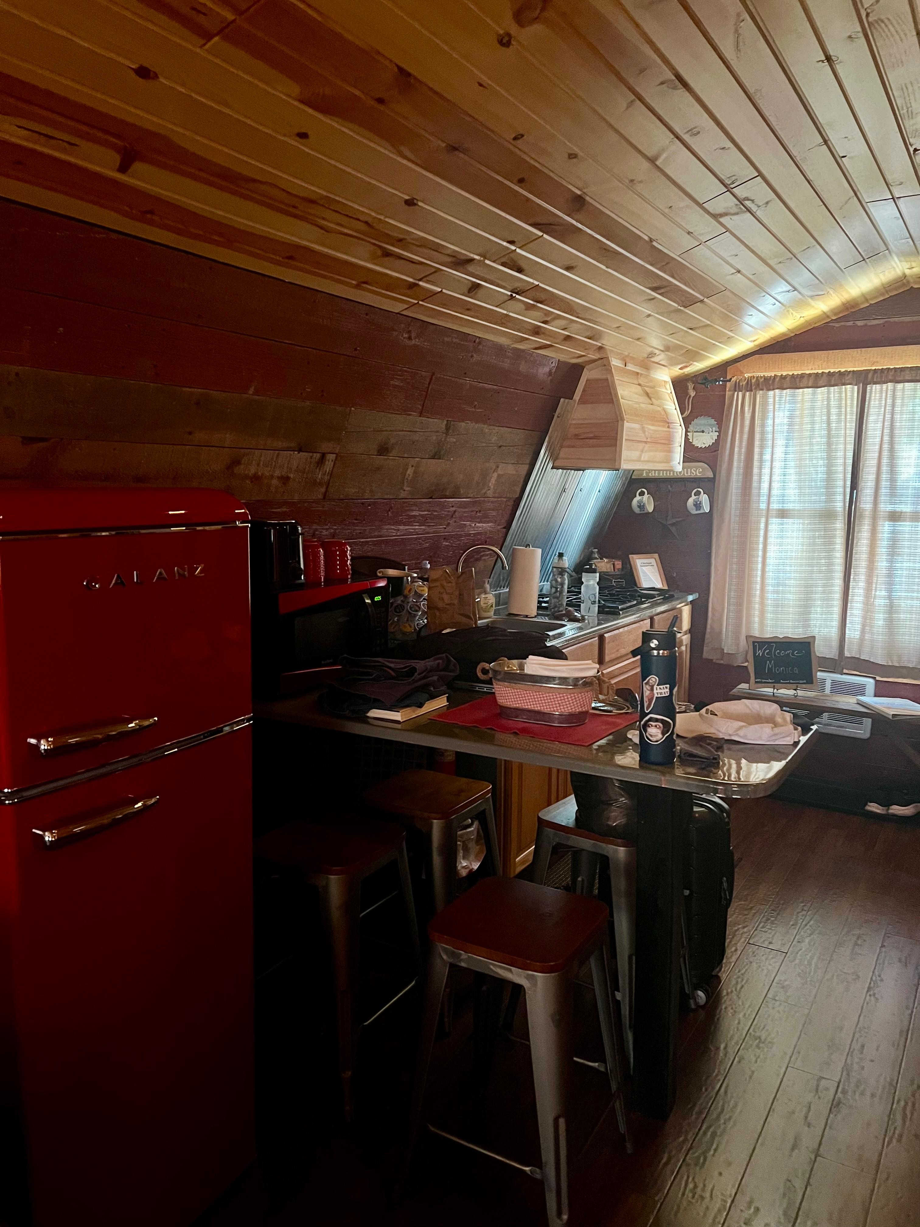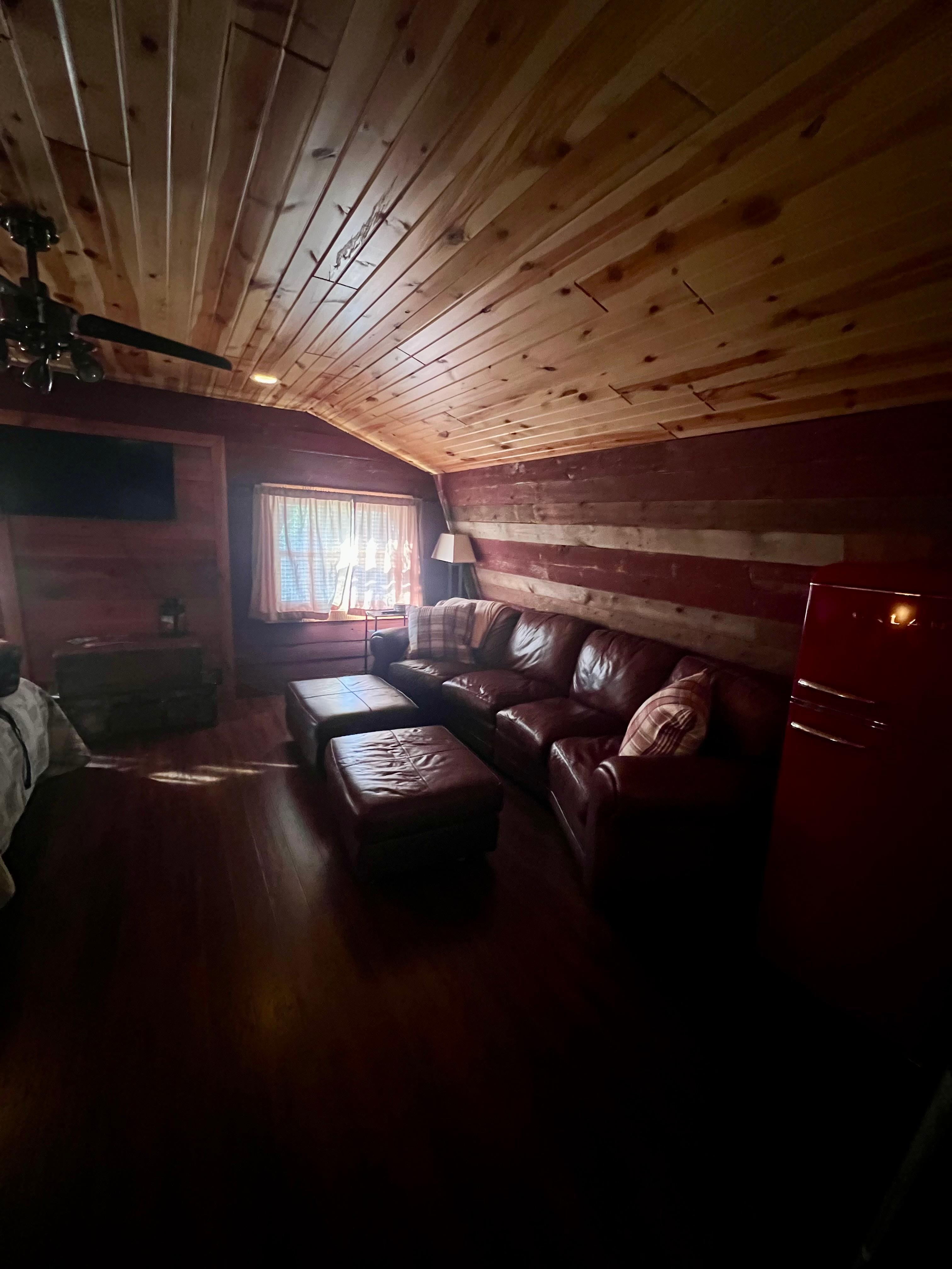 Our place is a 10-minute drive to I-35/Ames. This space is a flat above a detached garage and has a lovely, cabin-like, rustic charm. The space is separate from the main house. The living room has a pull-out couch, increasing guest size from 4 to 6. This space includes a mini fridge, microwave, Keurig, a smart TV with streaming access, Wifi, a dining area, and an outdoor grill. It is not handicap accessible as it requires going up one flight of stairs. Quiet neighborhood. Close to nearby restaurants, parks, and fuel stops.