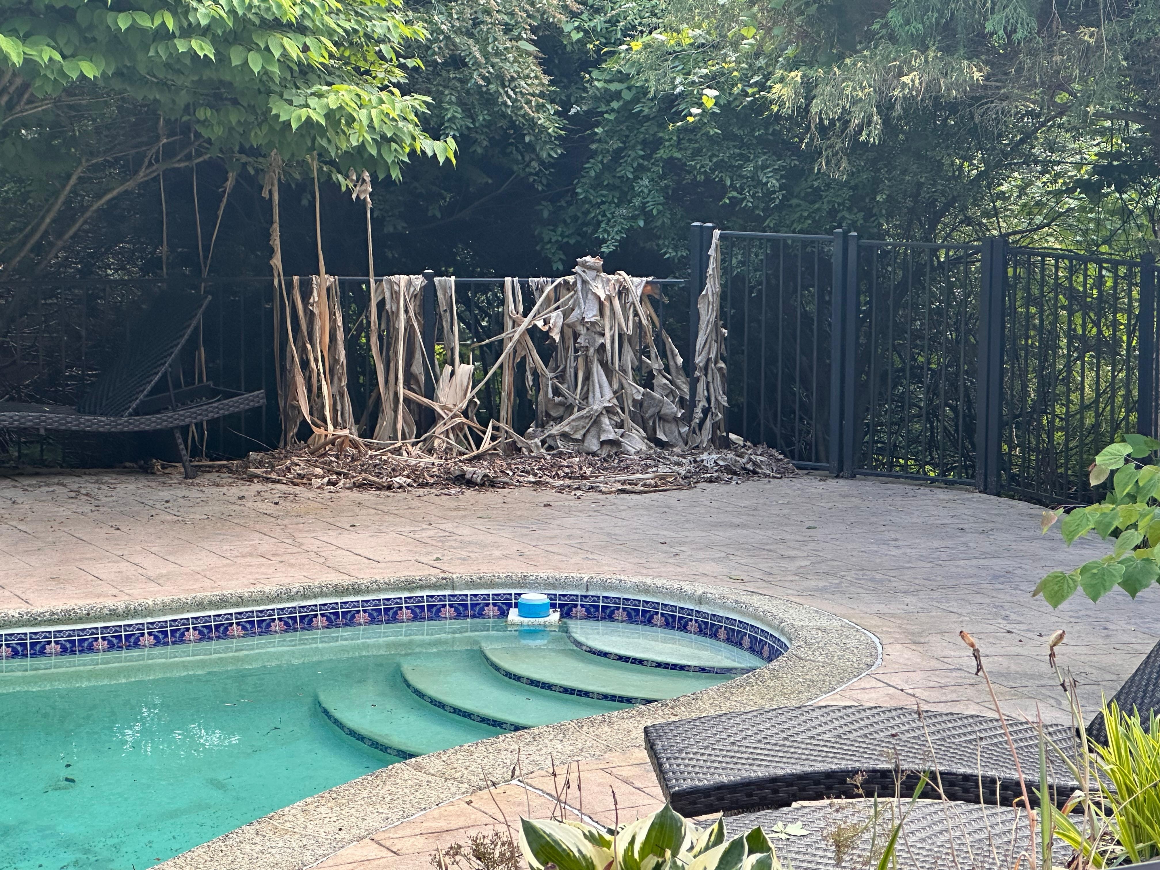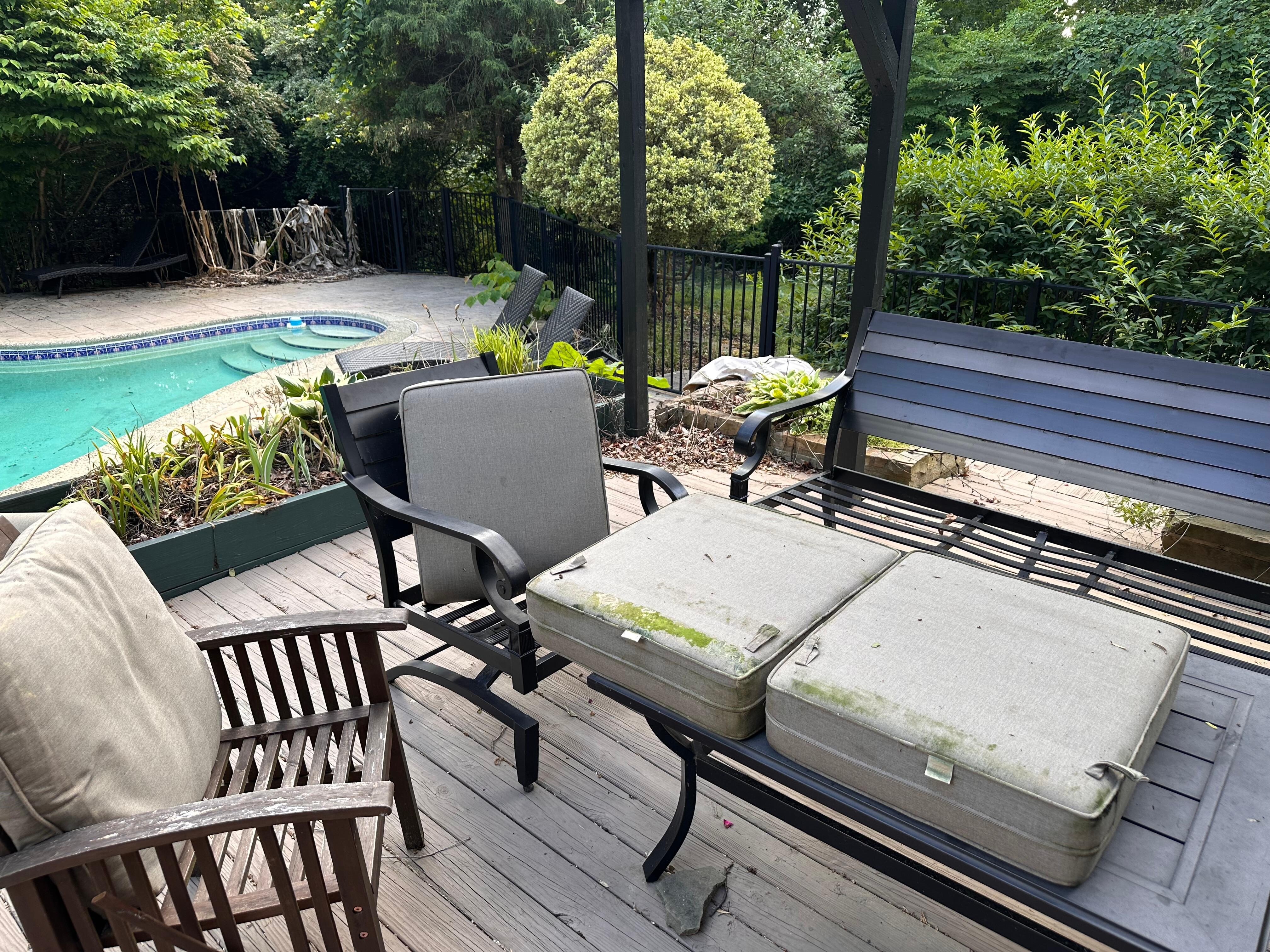 Inside was nice some stains, missing bulbs, broken ice maker, broken microwave (notified at check in but in earlier reviews), broken ceiling fan (also notified at check in). If children are present, there are tools & chemicals in their reach in kitchen cabinets. Open items like spices, coffee, tea, sugar, flour, pasta, beer, condiments, ice cream, hair care, soap and more. All open & used by previous tenants. Many are fine with this but it’s not safe or sanitary & they have ants. Opened windows to find dead bugs (even cockroaches) & dirt that need vacuumed out.All outdoor areas need cleaned,swept,weeds pulled,last falls spent blooms,piles of dead leaves,the pool hadn’t been cleaned,outdoor cushions waterlogged with moss. The pool missing ladder from the deep end & no lighting on it, both safety problems. A few feet from house & it’s pitch black.It’s quiet & secluded but HVAC came Friday & landscaper for hours on Saturday/Sunday so our privacy was lost to preparing for upcoming tenants.suggestions: organizing for safety, sweep patios/decks, add safety lighting outside, put a binder of property rules instead of sending a ton of messages at check in, schedule landscaping, HVAC, and pool maintenance during non booked hours instead of inconveniencing guests, & go through the items left behind & evaluate for potential expiration, safety concerns & compliance with public health.
