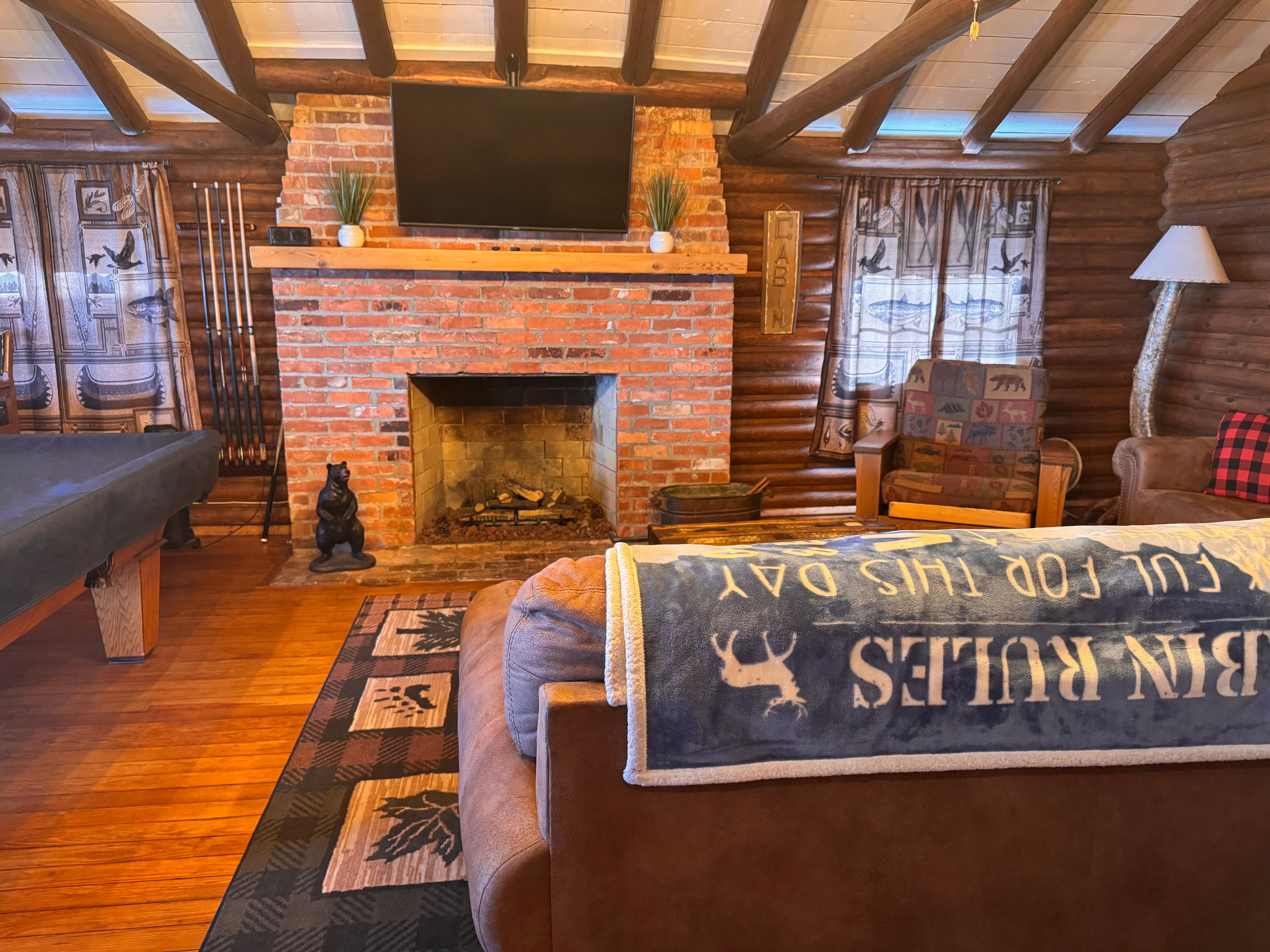 Our cabin has a warm cozy feel but also a fun filled vibe. Bring your poles and fish, walk down to the beach or stay in to shoot a game of pool or play some darts or a friendly game of checkers, or have a cozy fire.