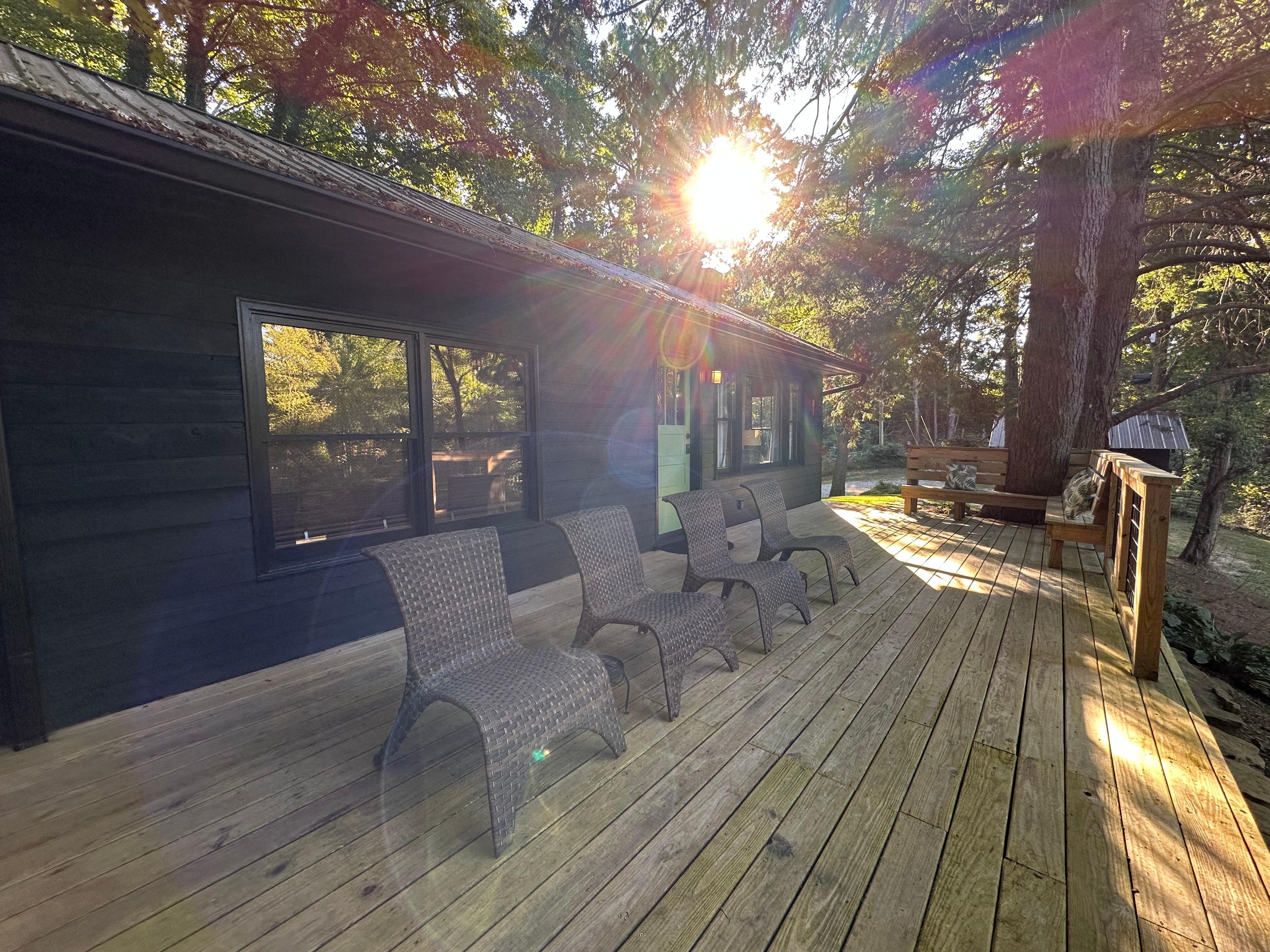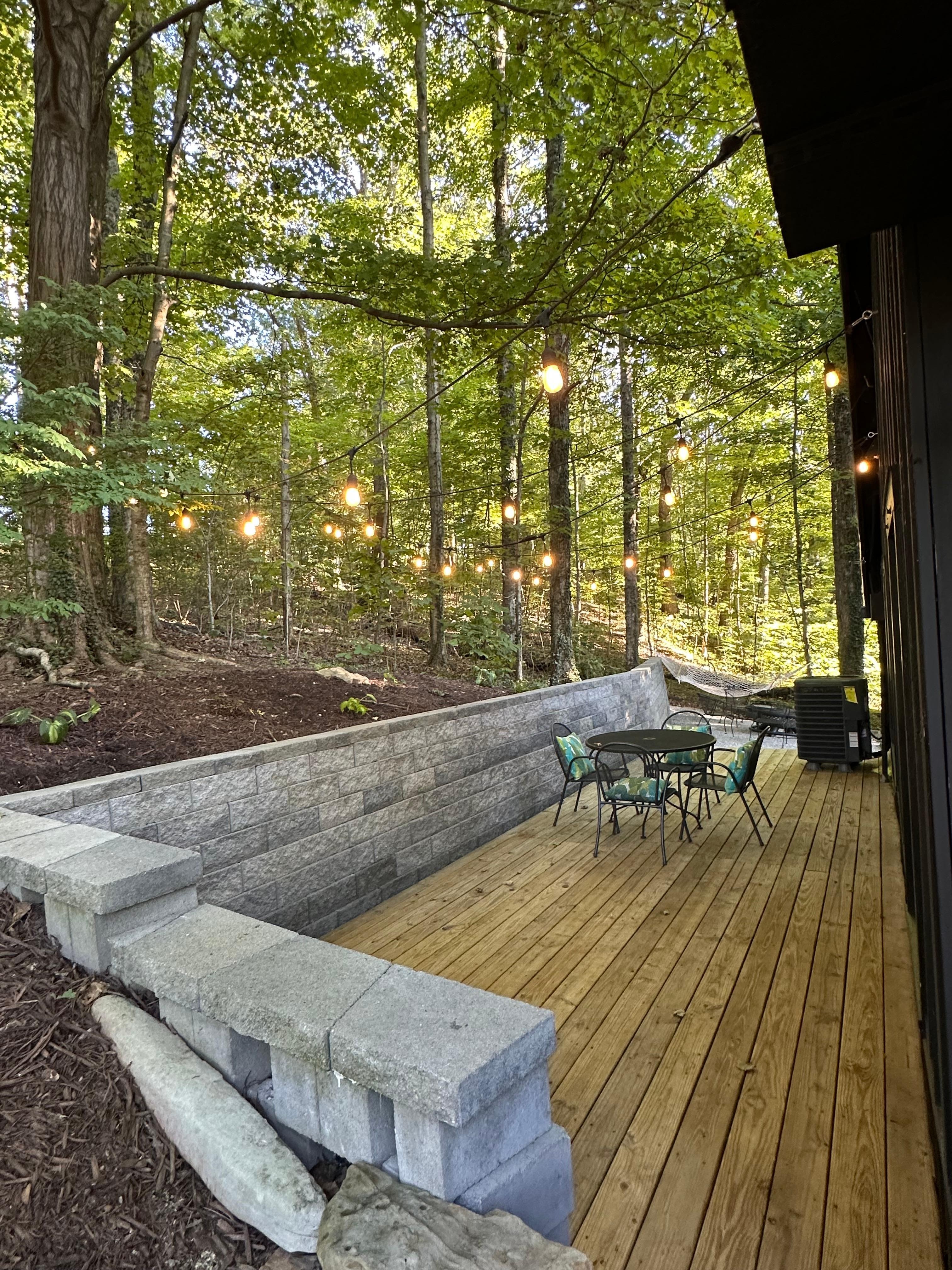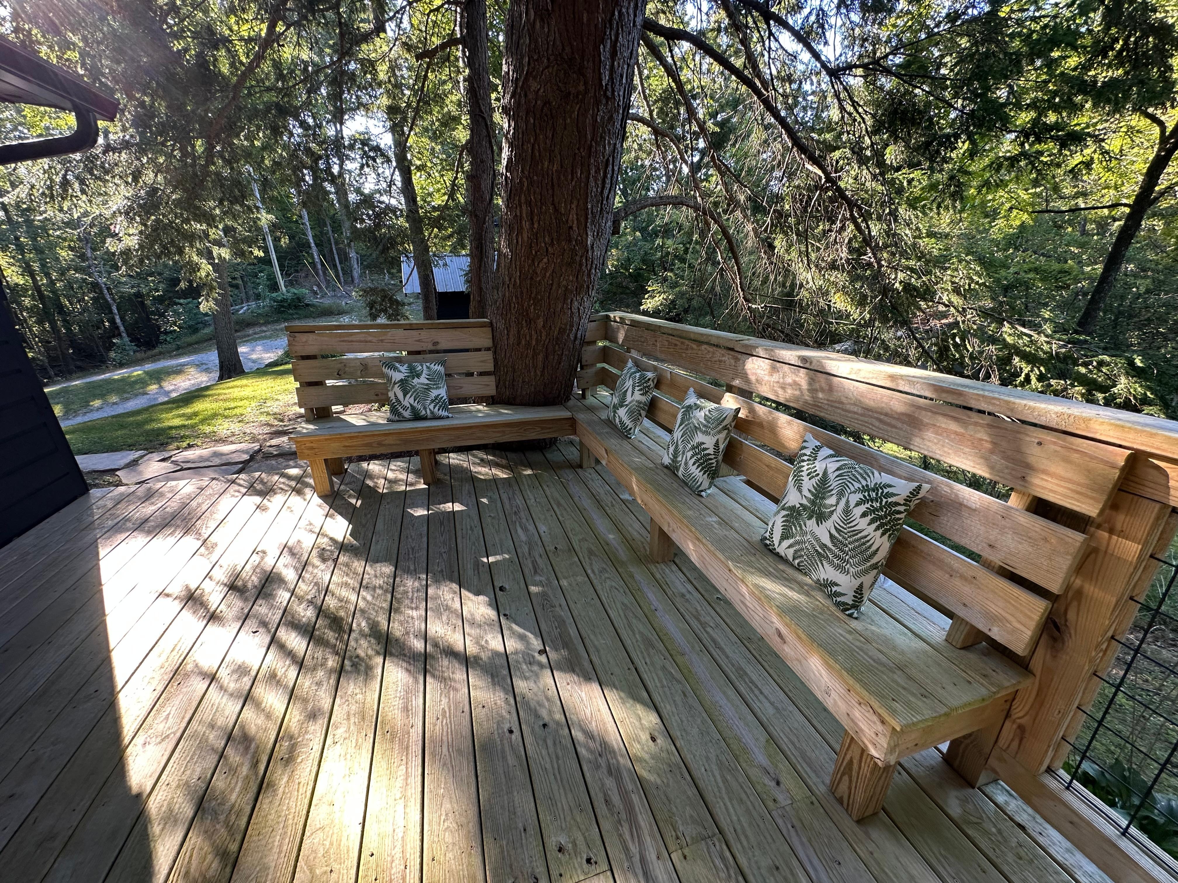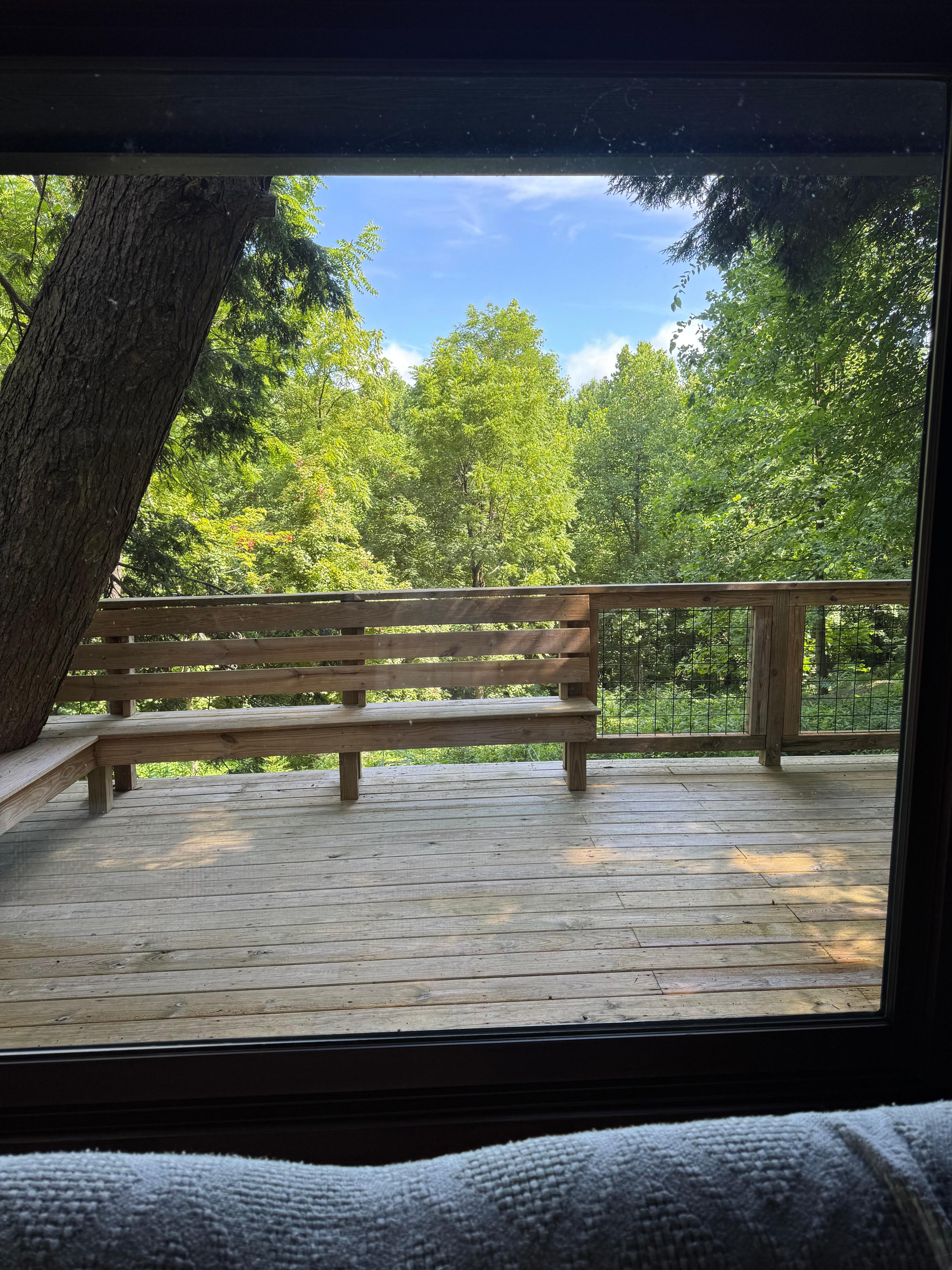 It’s a cabin nestled in 9 acres of woods. There is an entrance gate followed by a gravel drive to the parking spot next to the cabin. There are rock steps without handrails leading to the doorway. An elderly person or person with balance difficulty might need assistance to navigate the steps leading to the front door. The entire cabin, patio and woods are available to stay in and explore.