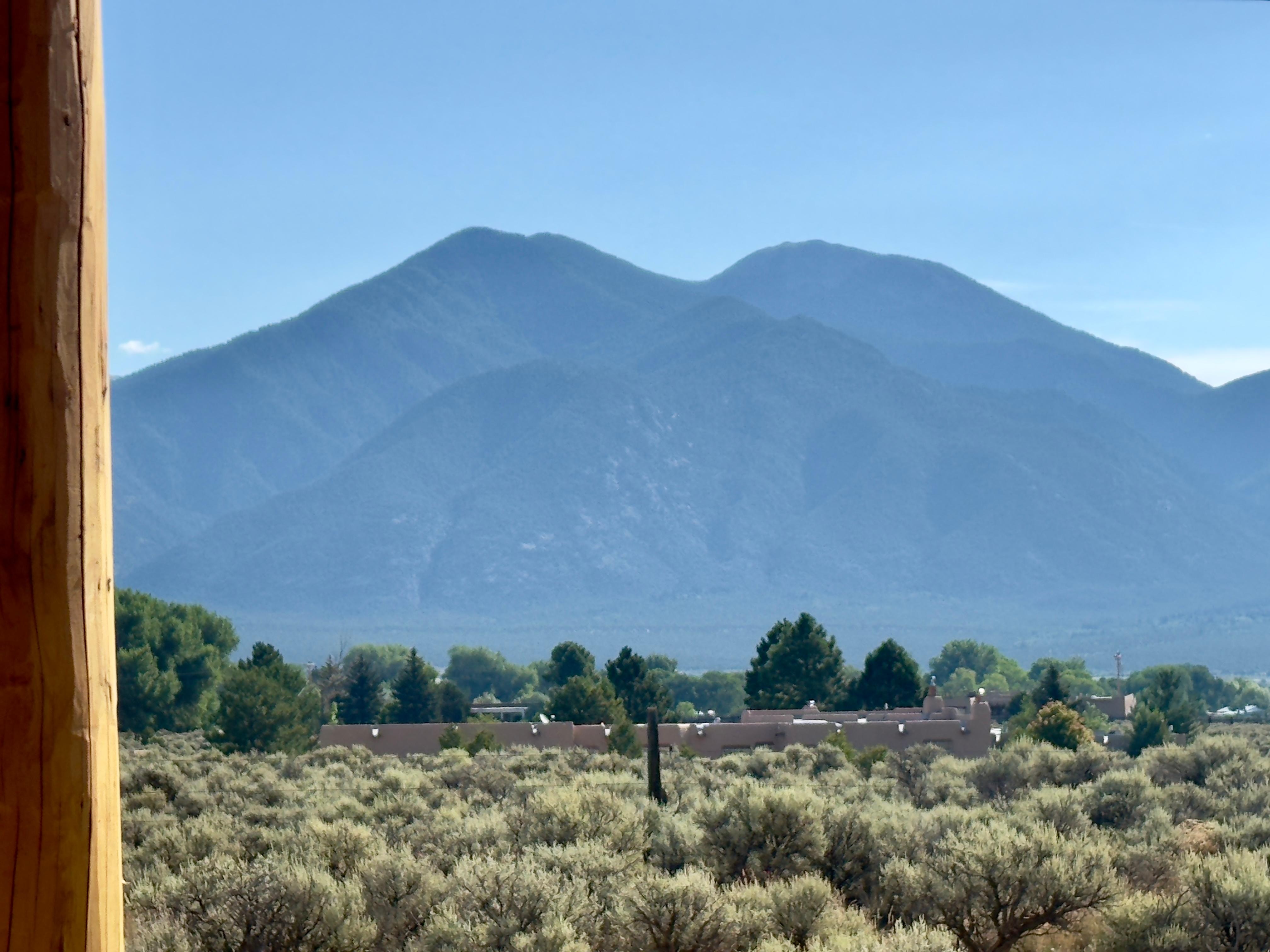 Come stay in this brand new 3-bedroom, 2 1/2 bathroom home and encounter everything Taos New Mexico has to offer! You will walk in and be amazed at the 16 foot high ceilings in the living areas with traditional locally sourced vigas (ceiling wooden beams) throughout the home with excellent views of the Taos mountains from large windows and glass doors. It is tastefully decorated with furniture and artwork collected from a life of living and working overseas in many countries. Enjoy your morning coffee or sunset happy hour on the covered patio gazing across pueblo land to the surrounding beauty. The master shower is a piece of art with multiple faucets giving a spa effect.