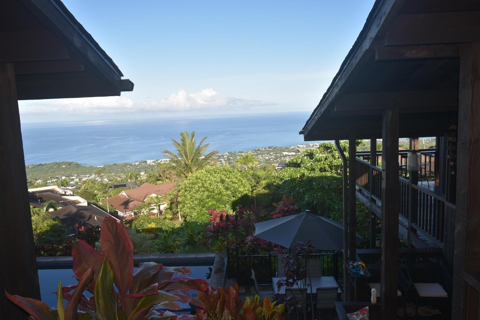 At Heart of Hualalai, feel a world away, yet close to everything as the home is located less than 10 minutes from downtown Kona and local beaches. Expansive ocean, coastline and garden views, from Keauhou Bay in the south to the Kona airport in the north are ever present. There is nothing quite as soul soothing as gazing westward to the ocean while sipping a cup of hot Kona coffee in the morning or enjoying the epic sunsets with a frosty beverage, from the lanai bar, in the evening.