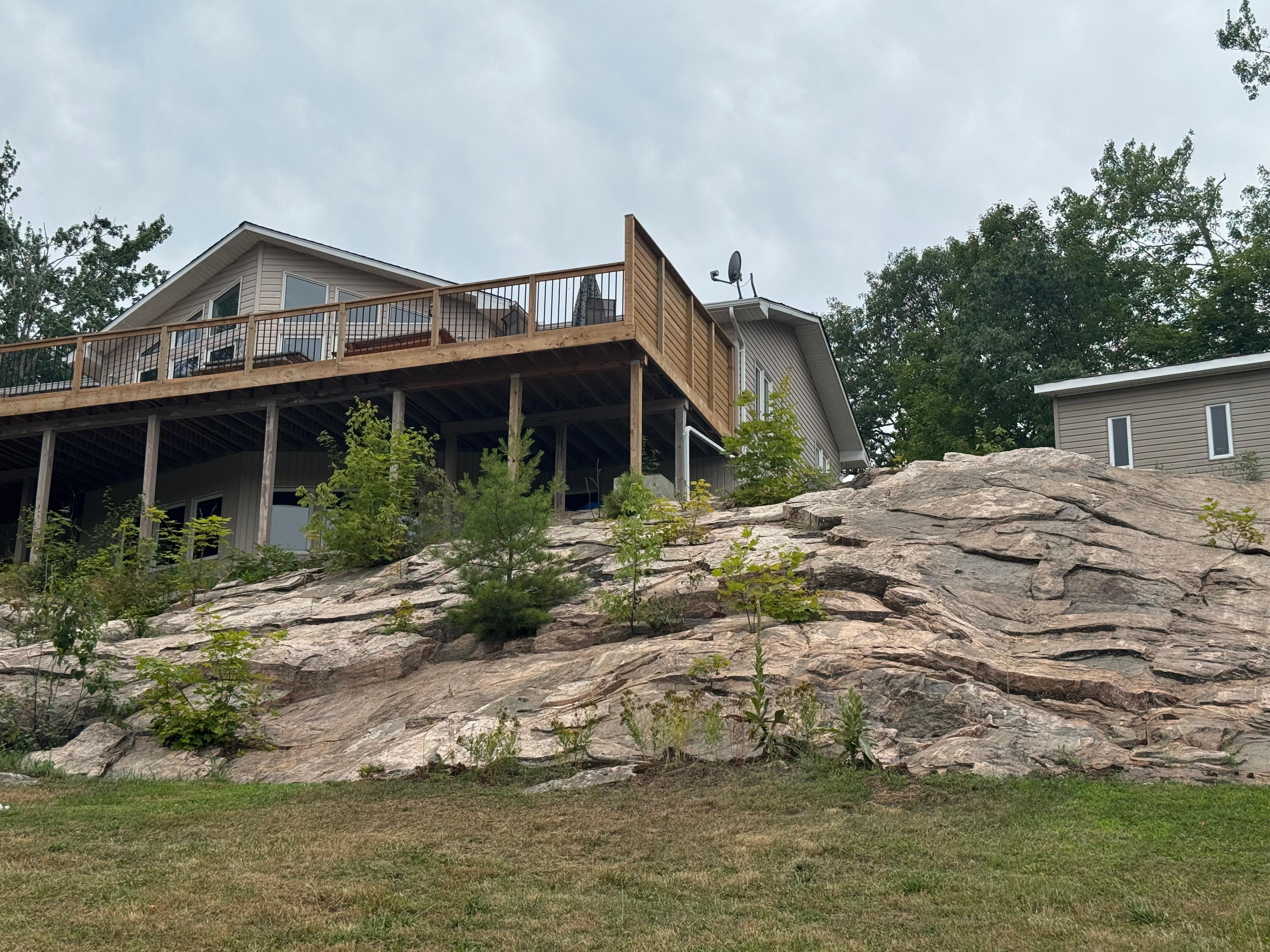 Located at the end of the road, this 3,000 square foot lakefront Royal Homes cottage has a 200' frontage and overlooks a bay. This cottage also features a 100-square-foot rear deck to catch the evening sun. The Royal gives you all the comfortable space you need. There is plenty of room for activities on the grassy frontage, sand beach, and dock. Cook a BBQ lunch/dinner and eat right on the 700-square-foot front deck overlooking the lake. There are security cameras outside the cottage.