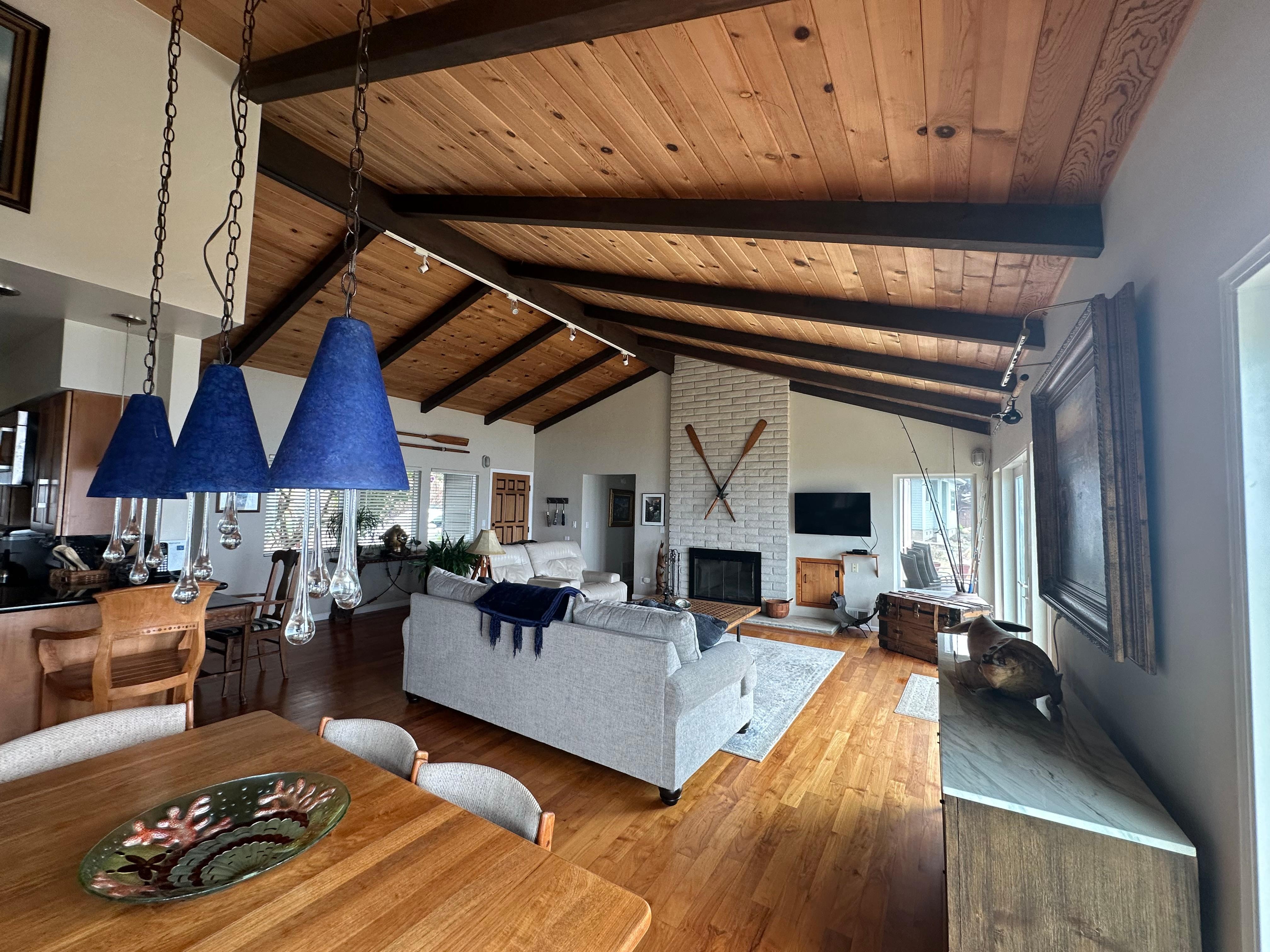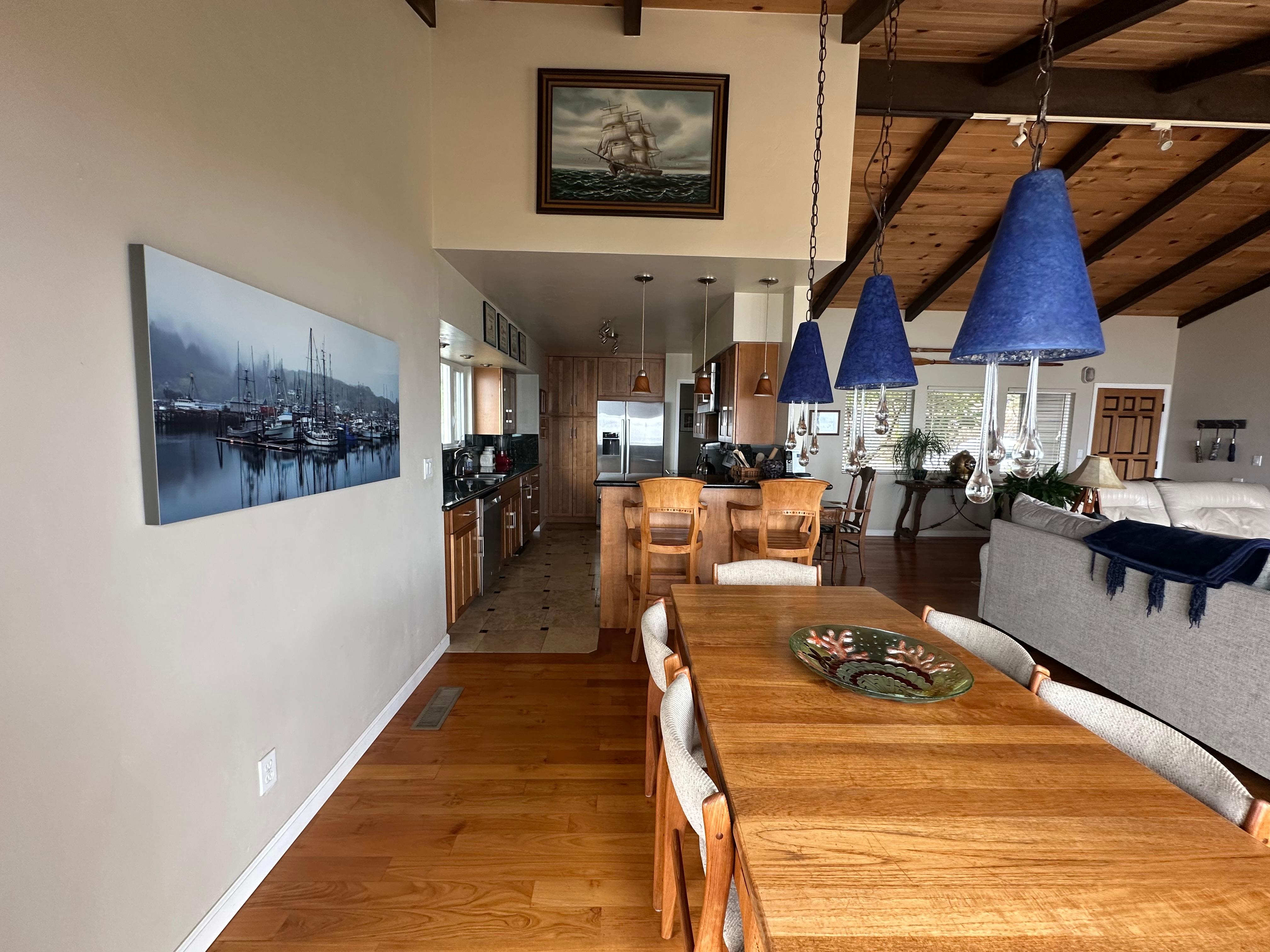 The back yard enjoys 227 feet of ocean frontage set 30 feet above a calm-water cove that provides fishing or gathering mussels. A glass protected deck and walls of windows offer an endless attraction for watching the resident colony of Harbor Seals basking in the sun with their pups on the reef below, migrating whales, porpoise jumping and pelicans in formation as they glide inches above the water. It is truly AWESOME!