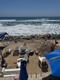 Beach-Level Patio: Features a BBQ, lounge chairs, and shaded seating.