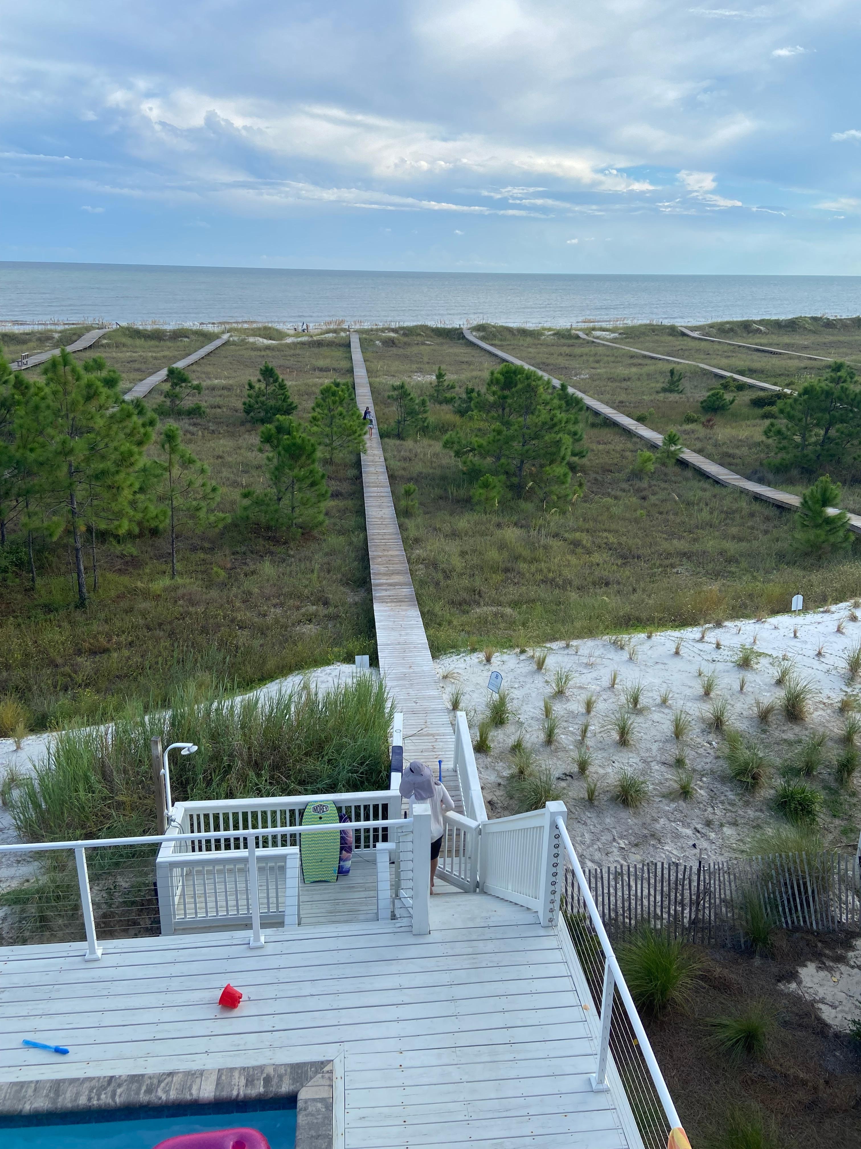 The first floor has a 1 bay view master suite with a king bed and attached private bathroom along with a bay view master bedroom with king bed. On the second floor, there are two Oceanfront master suite bedrooms with king beds and attached bathrooms, and a charming bunk room with 3 bunks and a full bathroom. The most inviting aspect of the second floor is that two of the bedrooms have access to its large deck overlooking the Gulf, while the bunk room has views of the bay.