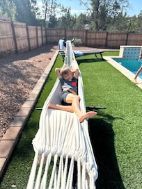 When you walk into Ventana Roja, you are immediately drawn to the large beautiful mid-century picture window framing in Thunder Mountain's peak. You are surrounded by beautiful desert landscape as well as numerous species of lush trees. Take in all the mid-century design features as well as one of a kind curated styling throughout to make the space cozy and relaxing. There is ample deck space out back that includes a fire pit with Adirondack chairs for relaxing by the fire and making s'mores, a large gazebo with covered dining for 8, the most comfortable hammock for stargazing or napping, as well as numerous yard games and space to explore! The entire kitchen and home has been stocked with all the essentials and more!