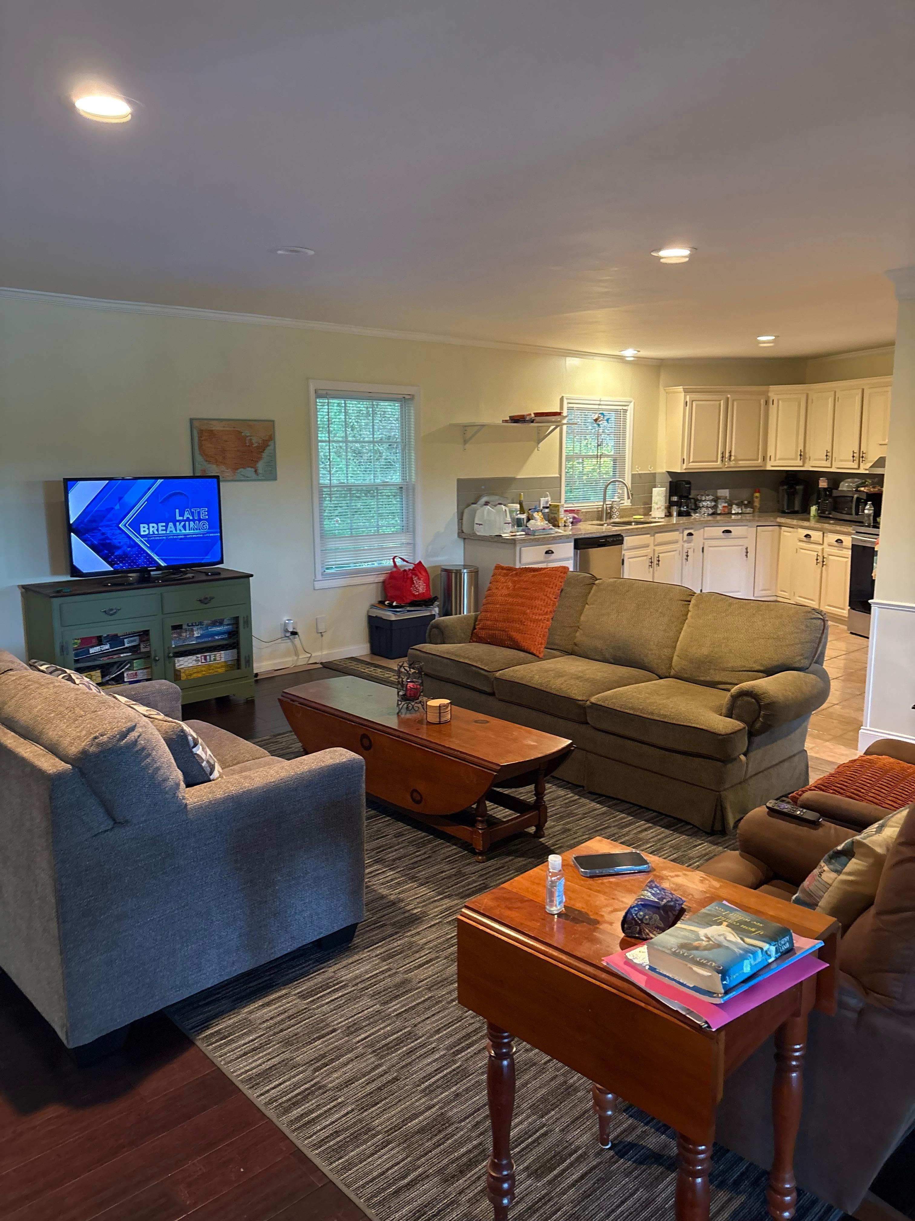 The main level features an open floor plan. There is a living room, TV, kitchen, dining area, reading nook, and upper deck. Also on main level are two master bedrooms, each with private bathroom with showers. Lower level has a bedroom, bathroom with tub, ping pong table, ladder ball toss, corn hole/bags, badminton, family room, laundry room, and covered patio.