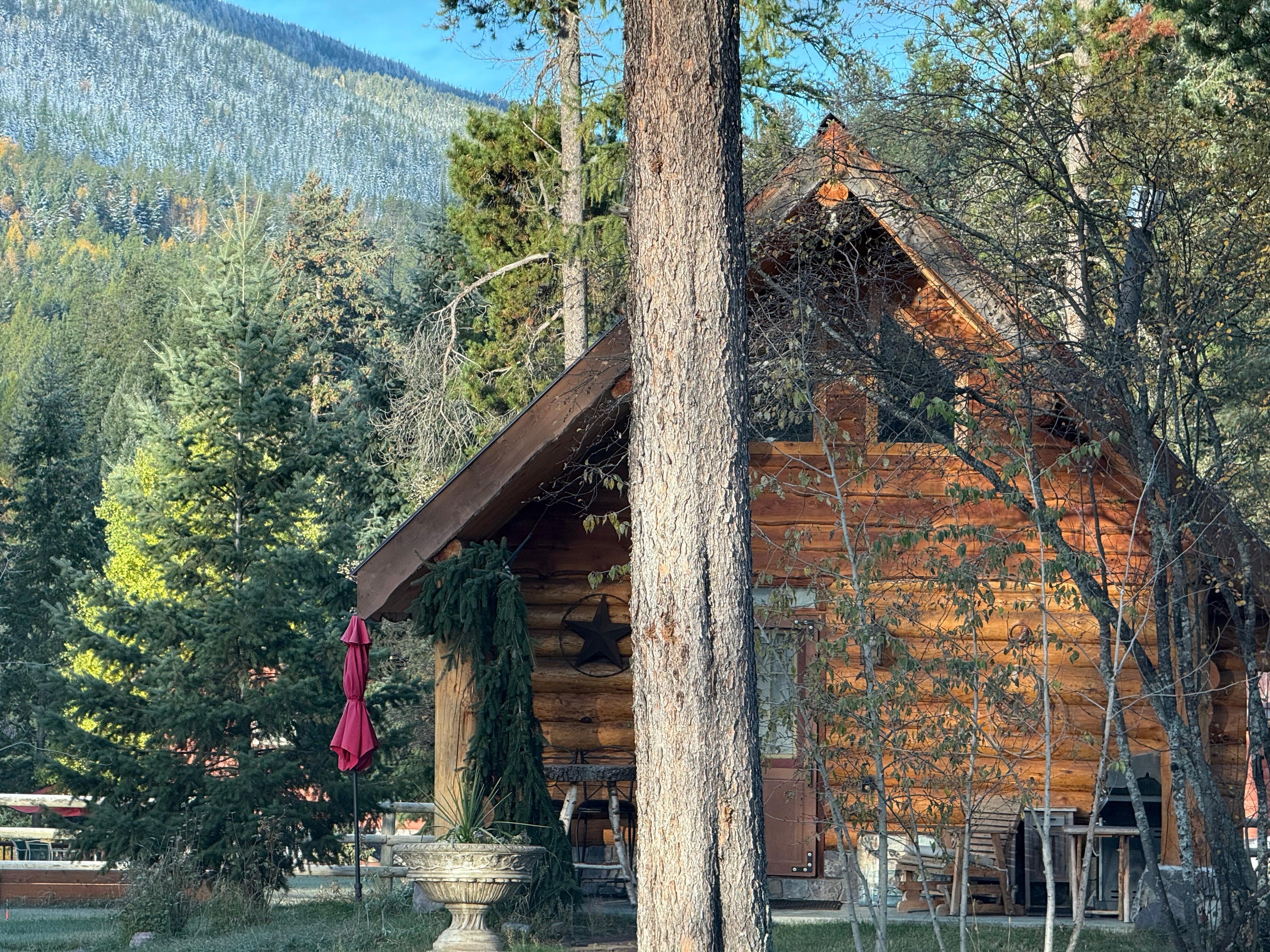 Quaint Log Cabin with loft bedroom, is a hidden gem, with lots of amenities to make your stay memorable in this little log cabin in the woods. Just 7 miles, minutes to the West Glacier Park Entrance. This 420 sq. ft. Loft bedroom with a cozy queen-size bed with quality sheets and layered bedding to make you sleep just right, the bed is accessed by a steep staircase (ladder) please see pictures. not accessible to handicapped elderly, or those afraid of heights. For those not wishing to sleep in the loft, there is also a queen-size hide-a-bed downstairs in the living room. Fully equipped kitchen, stocked with basic essentials, gas stove/Oven, microwave, full refrigerator, sink, pots and pans, dishes, dish soap, towels, paper towels and paper plates, coffee, creamer, sugar, salt pepper, spices, pop corn. All the fixings for S'mores and campfire sticks. Gas fireplace for cool nights, and air conditioner for warm summer nights. BBQ, and fire pit for a romantic campfire under the stars when there are no campfire restrictions in place by the county. (wood included). Private 2 acres with access to your own private deck overlooking the Middle Fork of the Flathead River, just steps away from your cabin. Guests enjoy the Zero gravity chairs, make for a great spot to watch the sunset, and watching the eagles fly by. The Hot Tub is on the lower deck of the main house, just a short walk from your cabin, overlooking the river and is a great way to relax after a long day hiking in Glacier National Park.