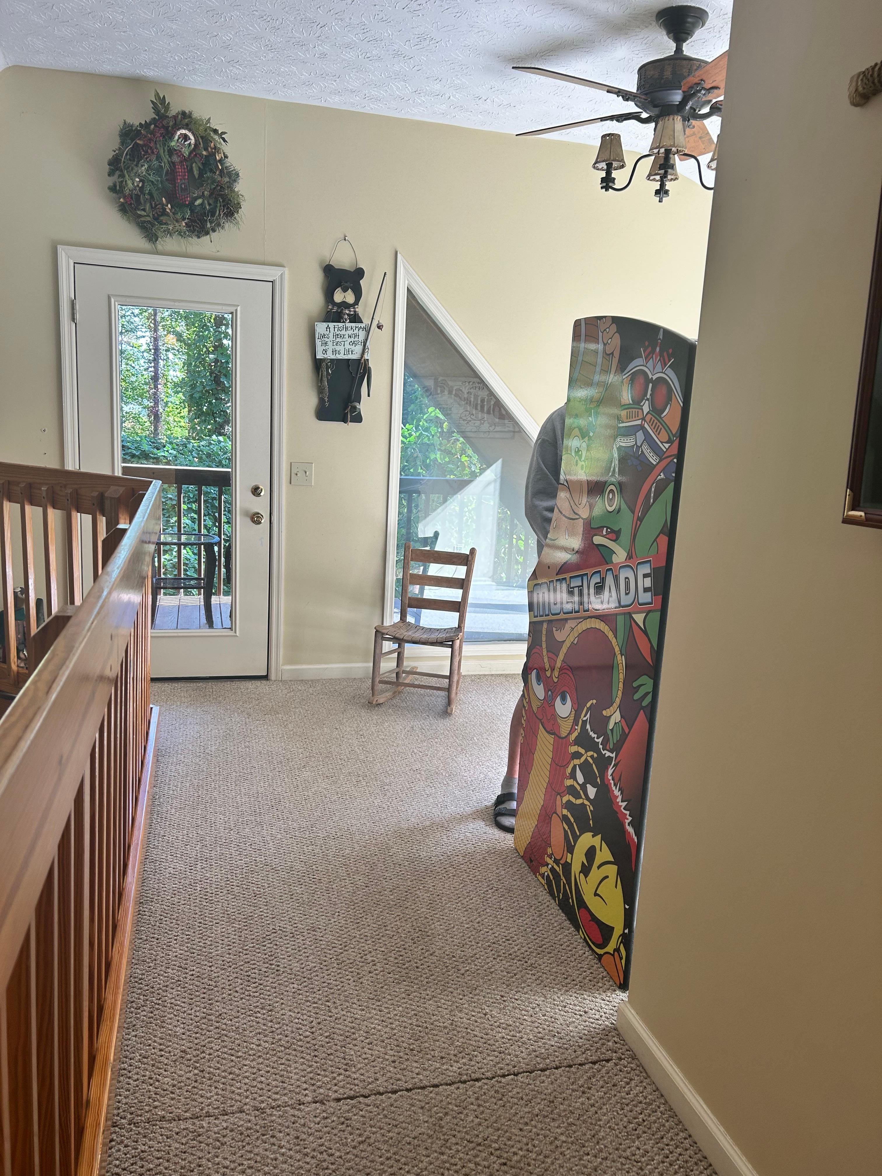 Enjoy the peaceful sounds of the nearby creek as you relax on the large private upper deck or the wrap around bottom deck with a grill and hot tub. Inside, the cabin features a separate gaming area for the kids to play, ensuring everyone has a great time.