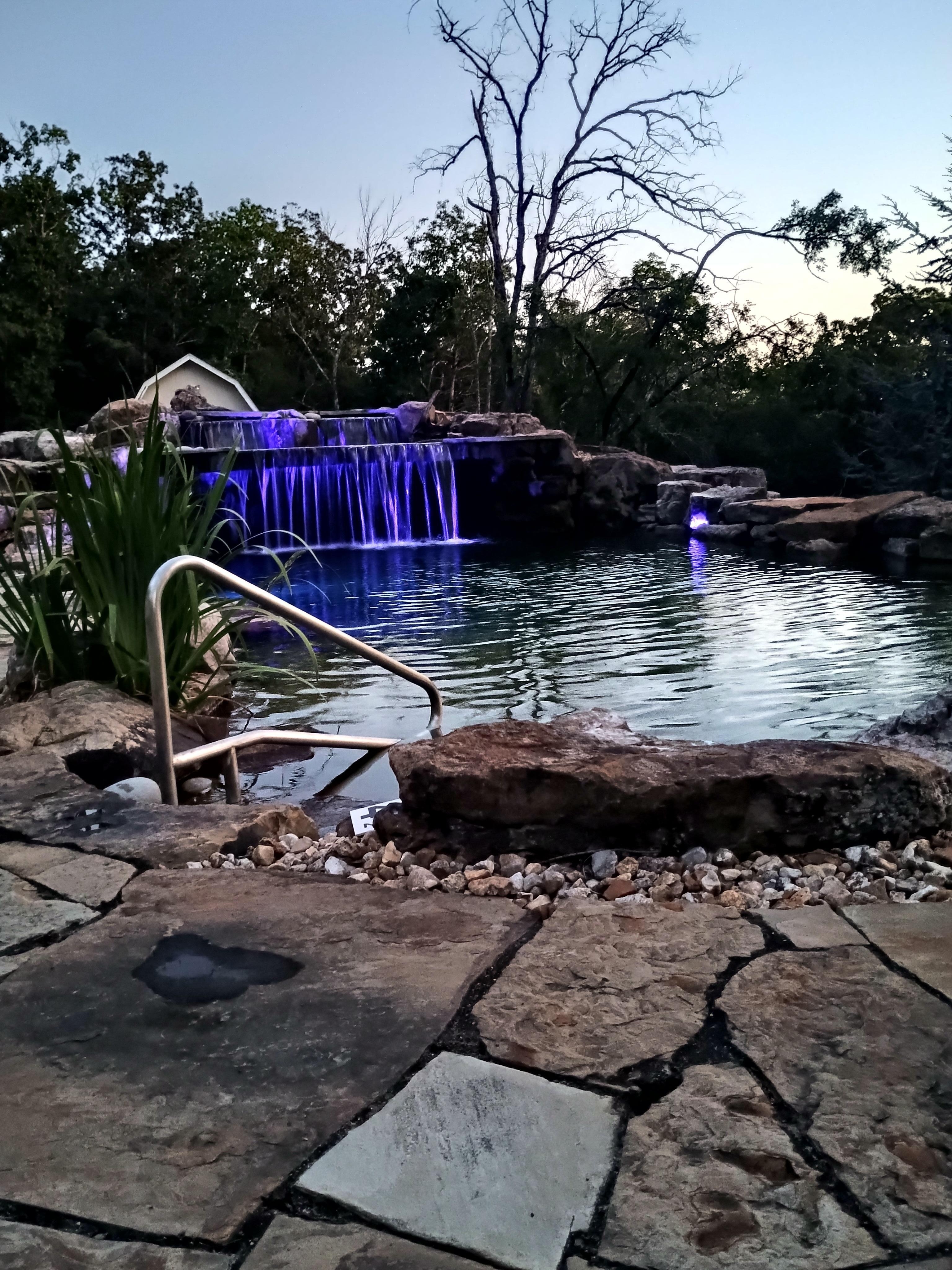 All units have access to our beautiful, naturally filtered Swimming Pond! The pond is 100% natural, so there will be fish, (Koi & Goldfish) bugs, tadpoles, frogs, etc. Please do not tamper with any harmless wildlife in the pond as their presence helps the pond’s ecosystem and helps keep it clean! You can enjoy the view of the beautiful waterfalls year round, however the pond is not heated.