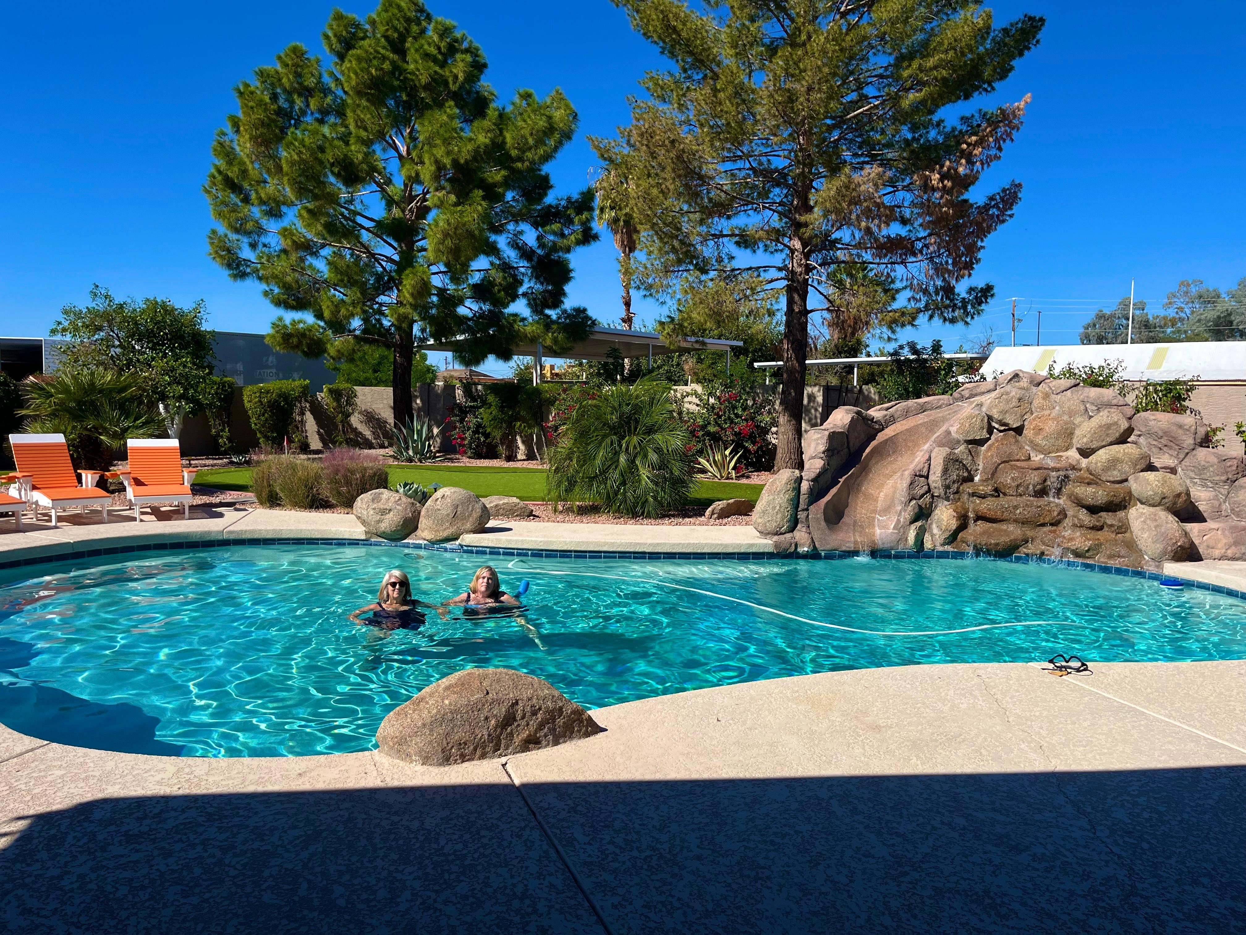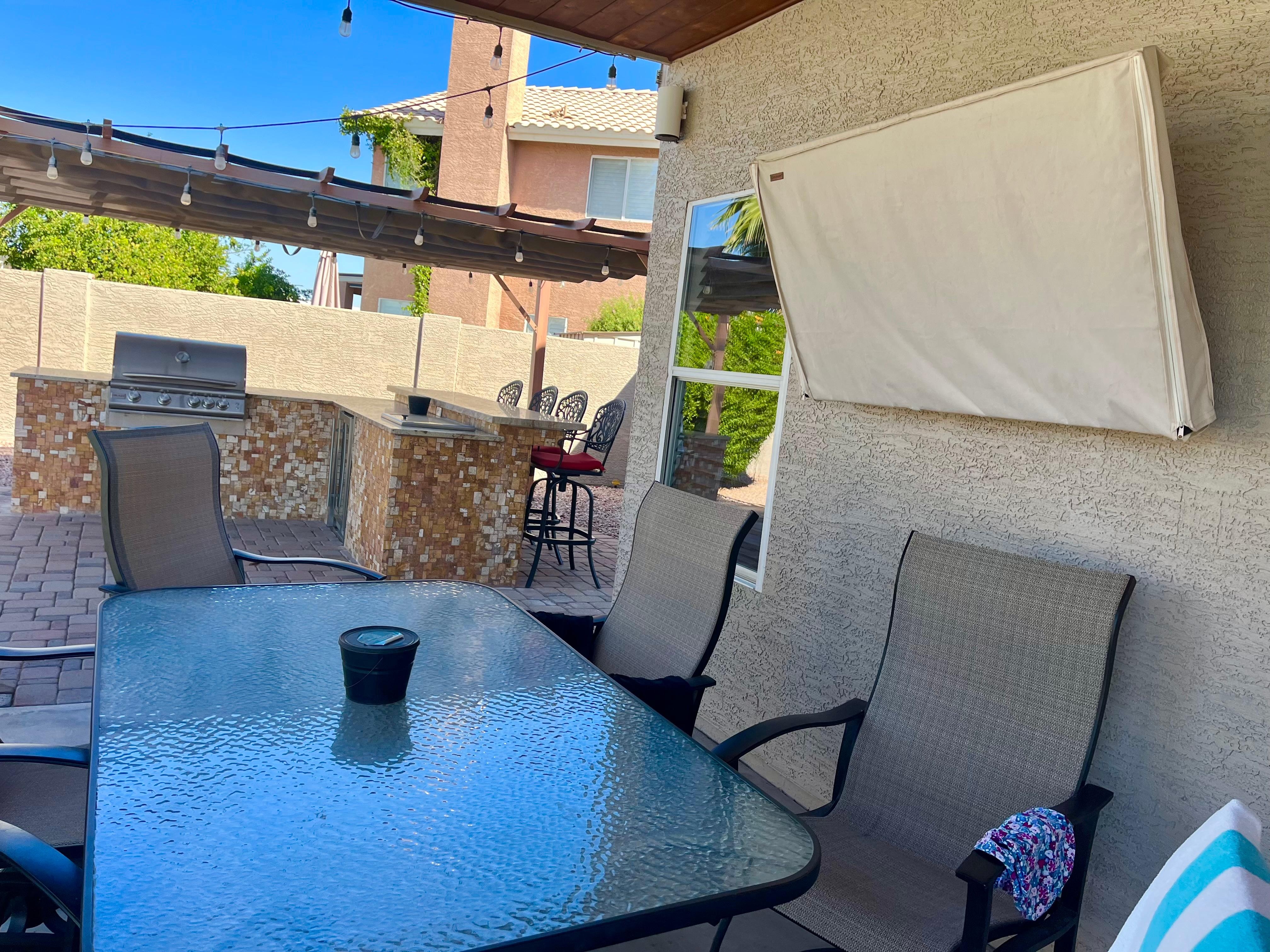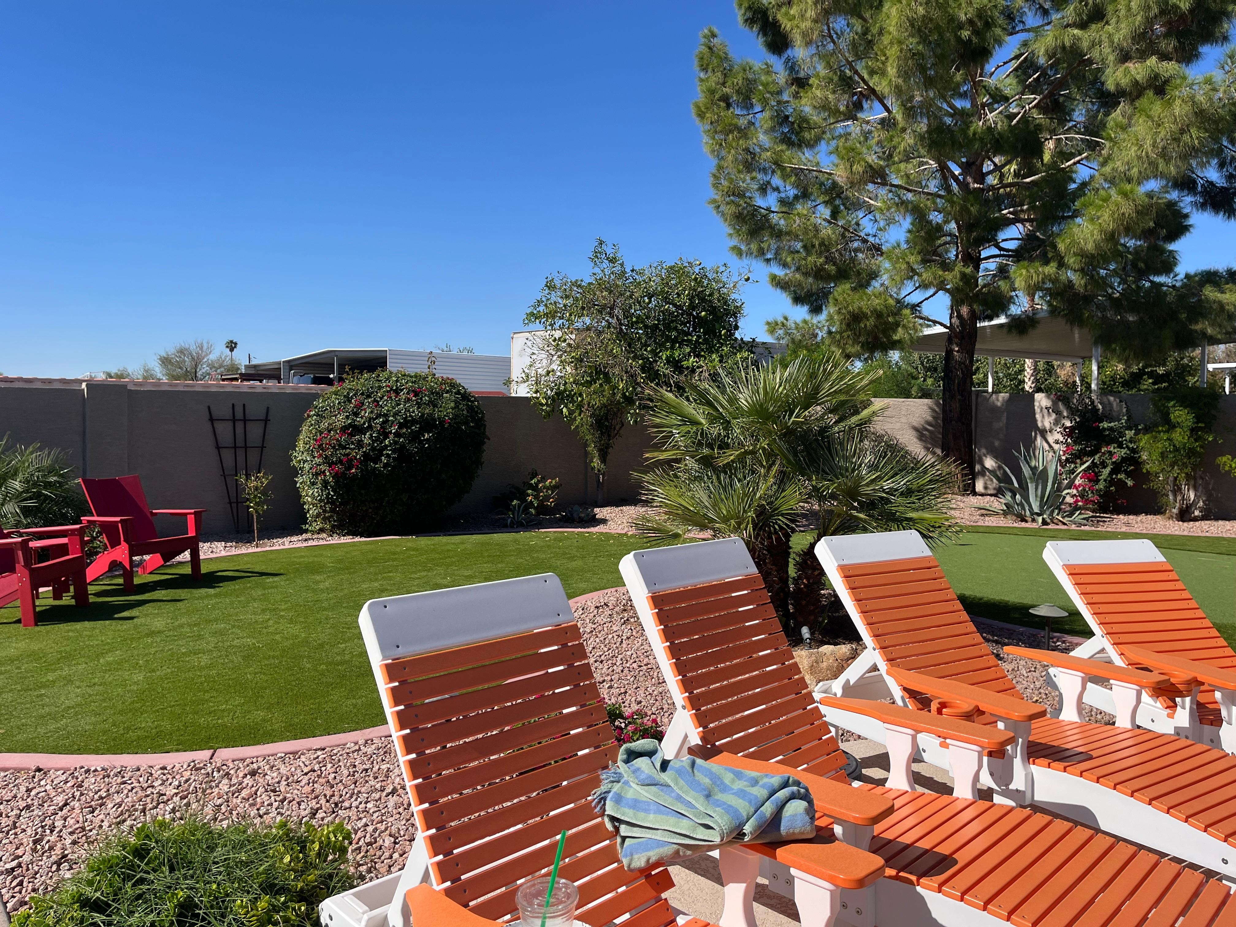 Step out back and prepare to have your mind blown with amenities. Nothing has been forgotten in this space. Starting with the completely resurfaced pool. The water is so blue, you will think you are in the Caribbean. The pool features a rock waterfall, a water slide and optional heating for an added fee. Just beyond the pool, you will find a cozy seating area with a firepit for those cool evenings. The outdoor kitchen will be a fan favorite! The culinary artist in your group will love the bar side company while they whip up a delectable meal. When you're not spending your days on the golf course, you can practice your putting and chipping skills on the brand new putting green. Love outdoor games? This place is for you! Ladder Ball, Basketball and Cornhole are all provided. The kids will fall in love with their very own park in the back yard. Saving the best for last, check out the poolside daybed. Imagine yourself napping in the shade after a long hike in the Arizona Desert! The pool can be heated for $60/night.